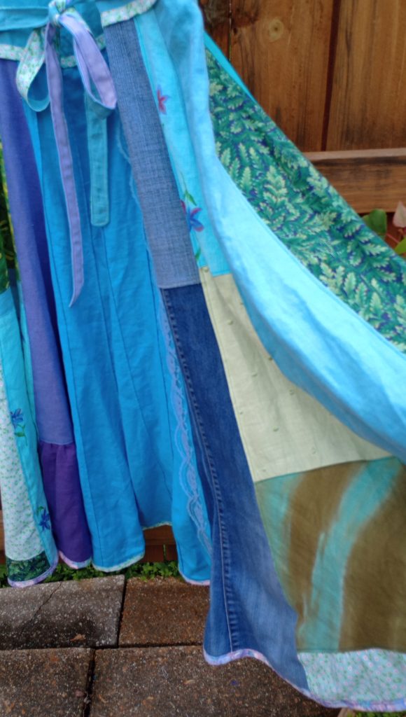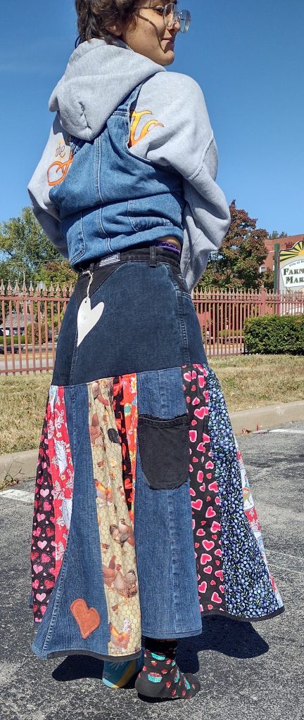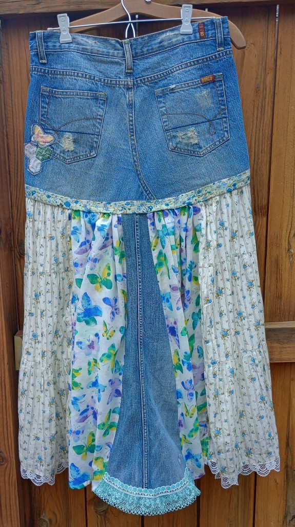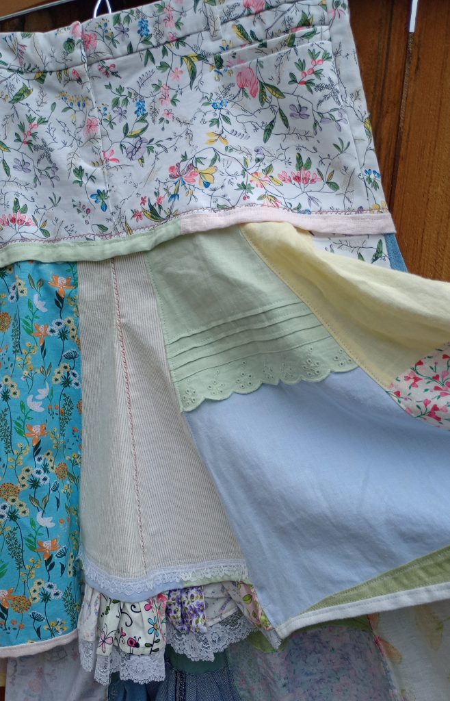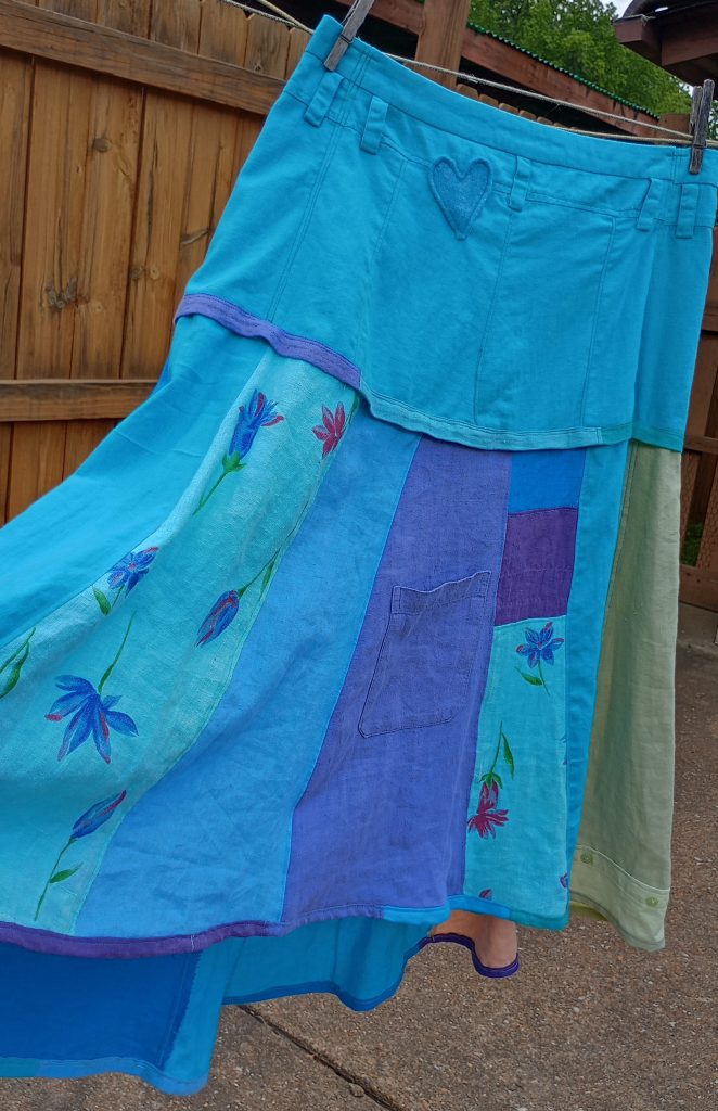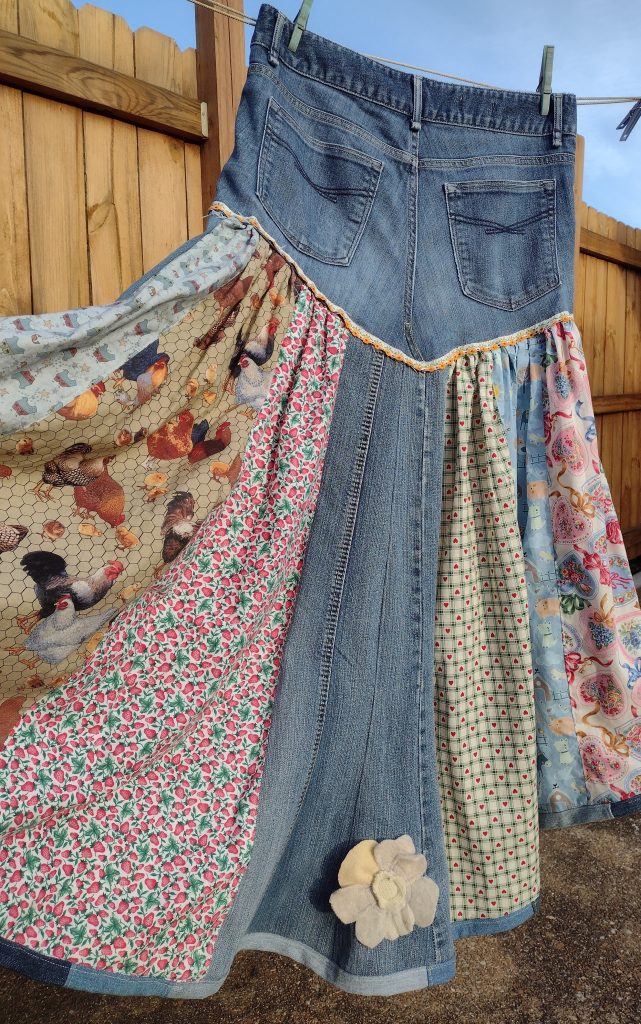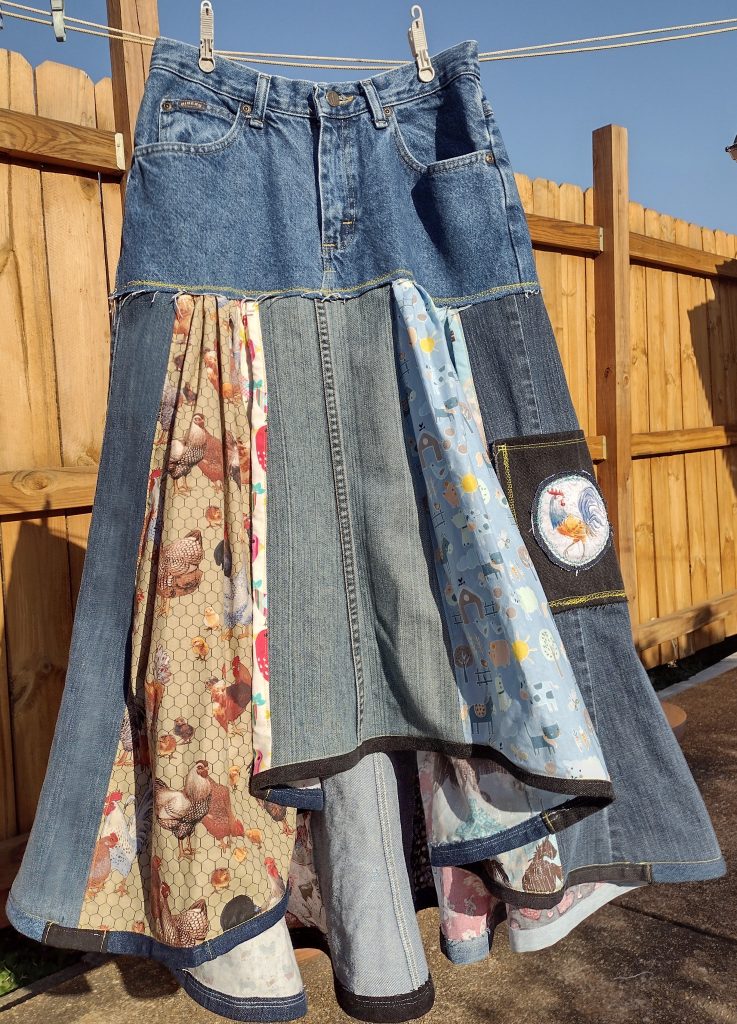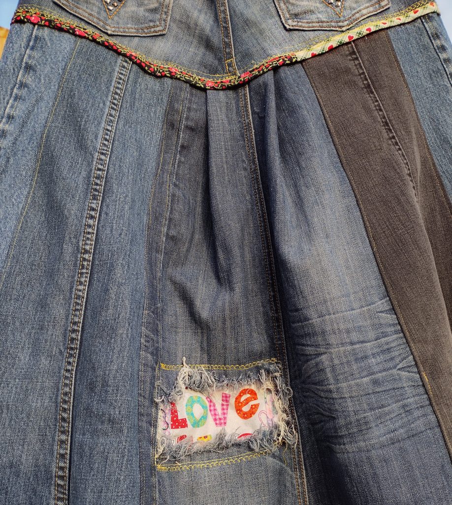 Lots o’ detail on this repurposed denim and cotton skirt. Ladies size 8/10. Please contact me for exact measurements.