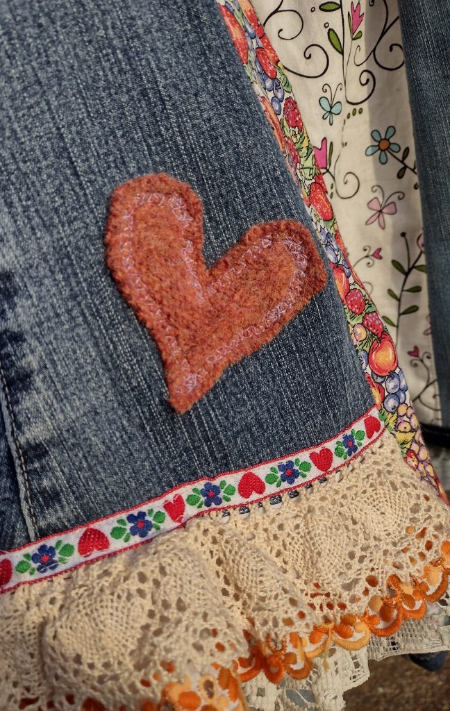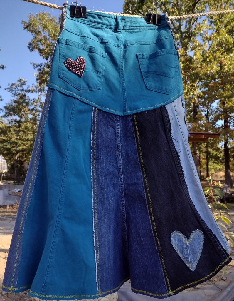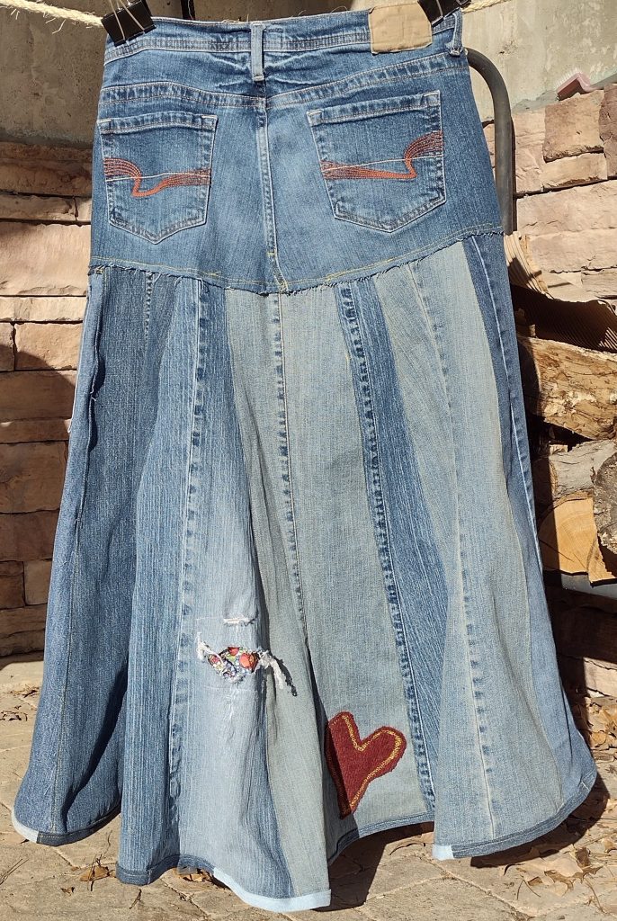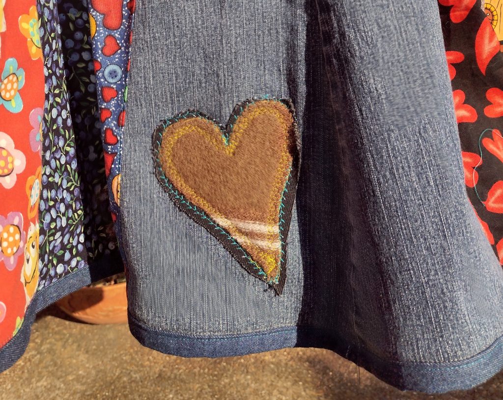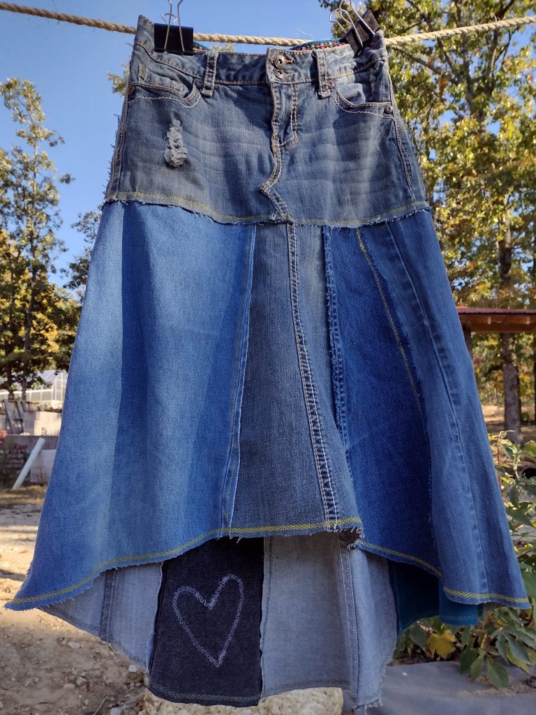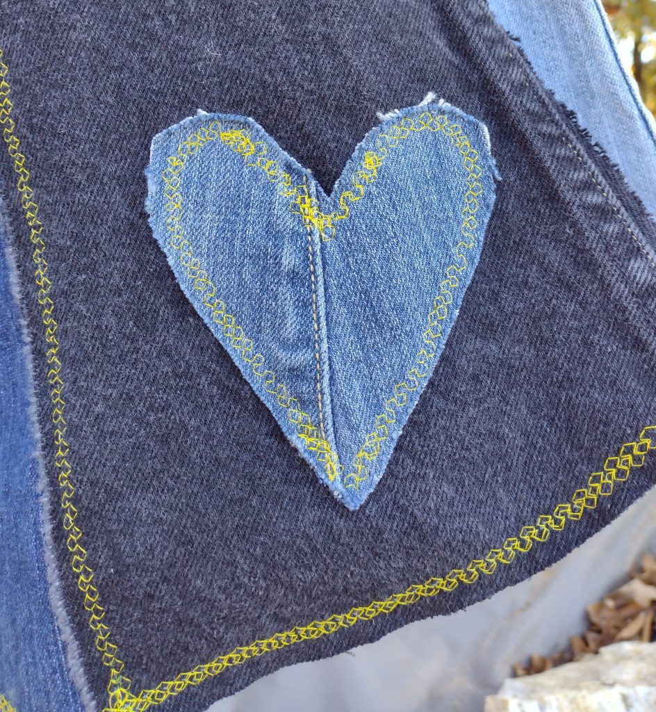 The following items for sale are one of a kind & lovingly crafted from approximately 99% repurposed denim, cotton, linen and wool. Many items were sewn using solar power.