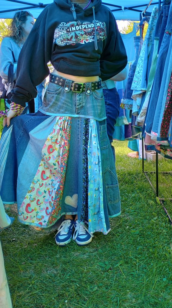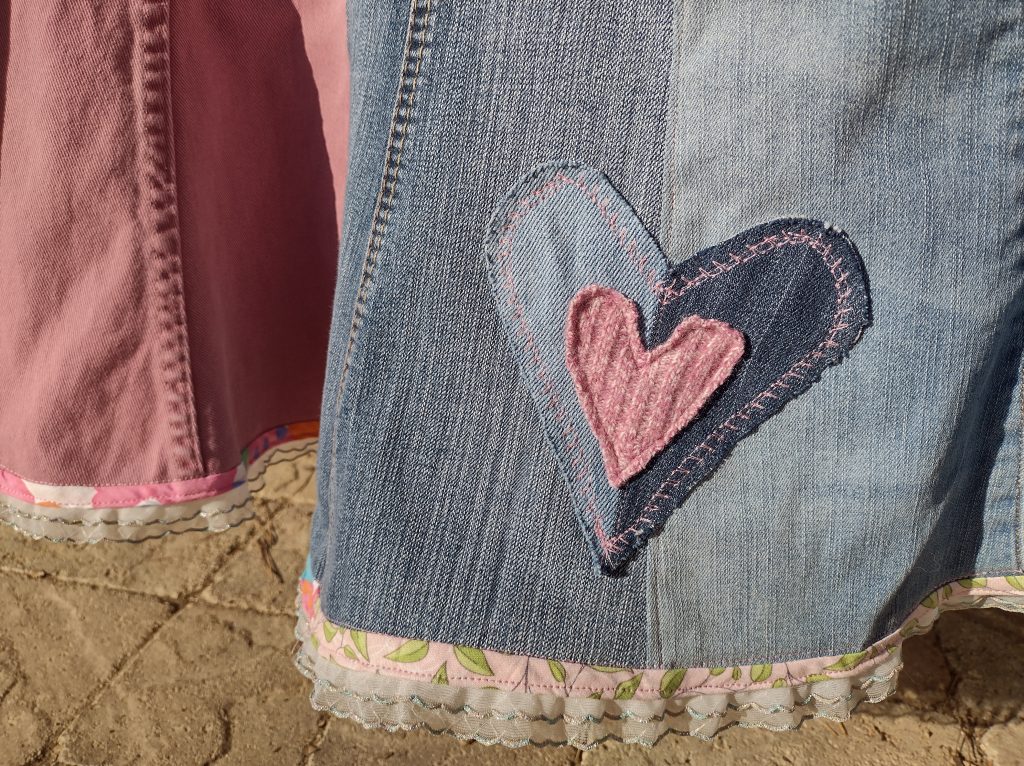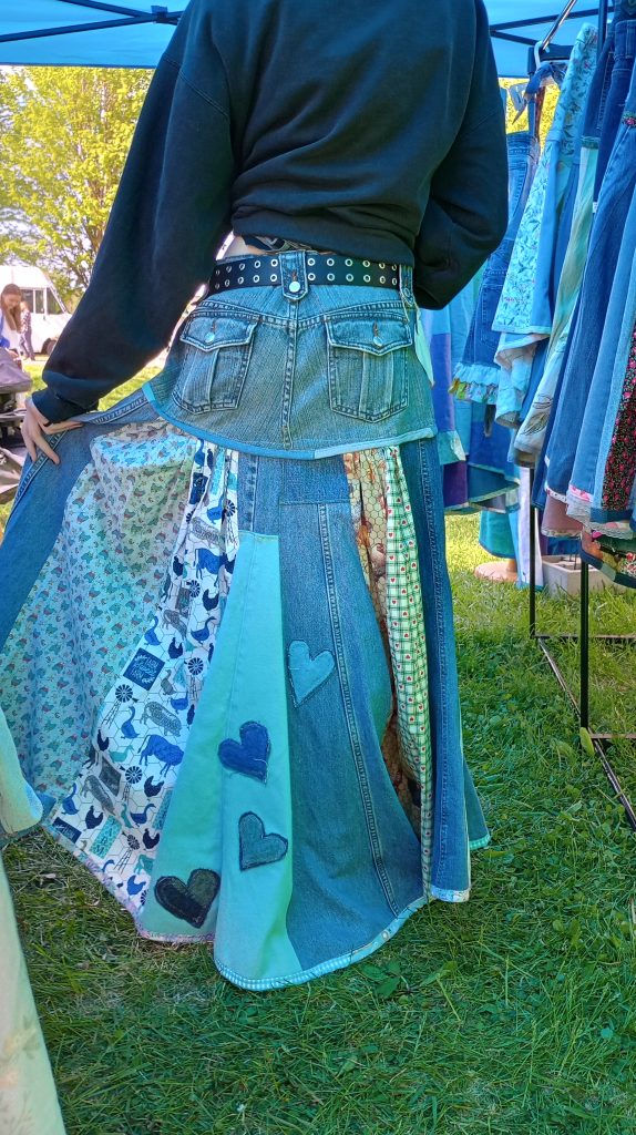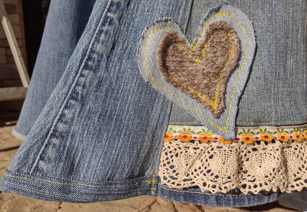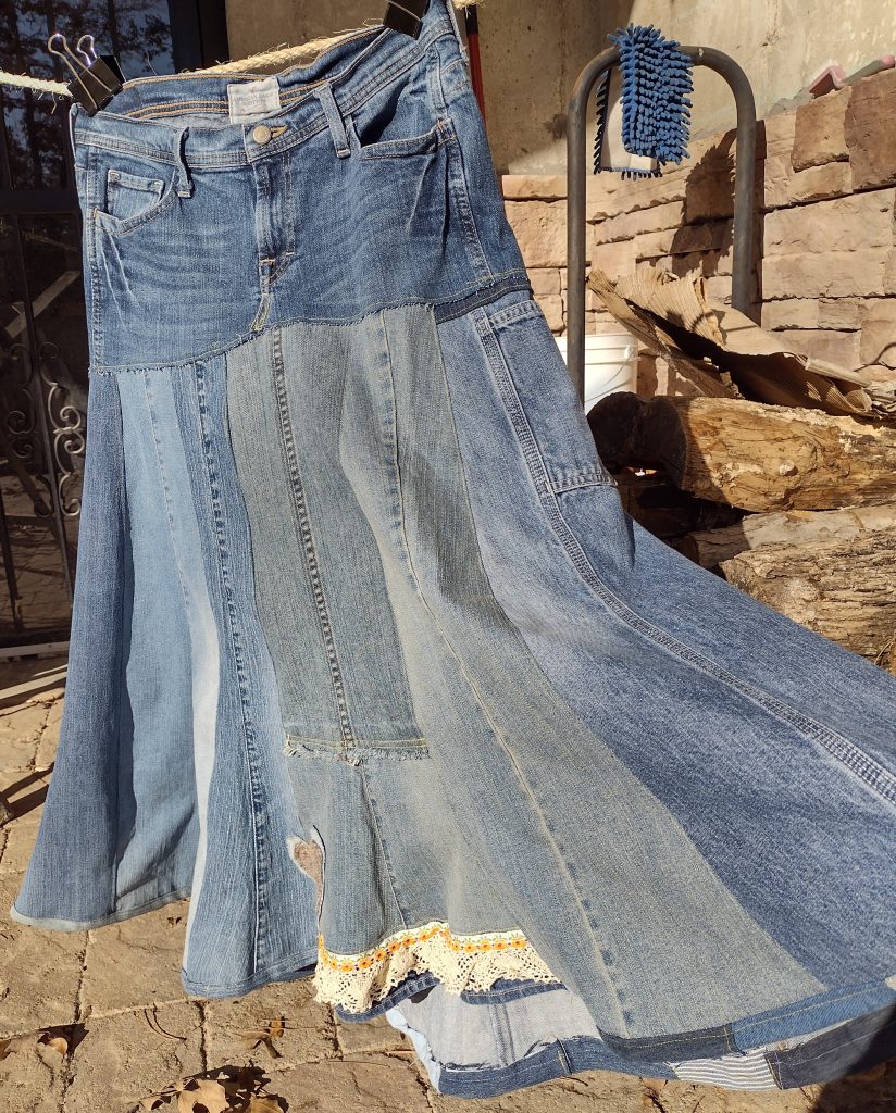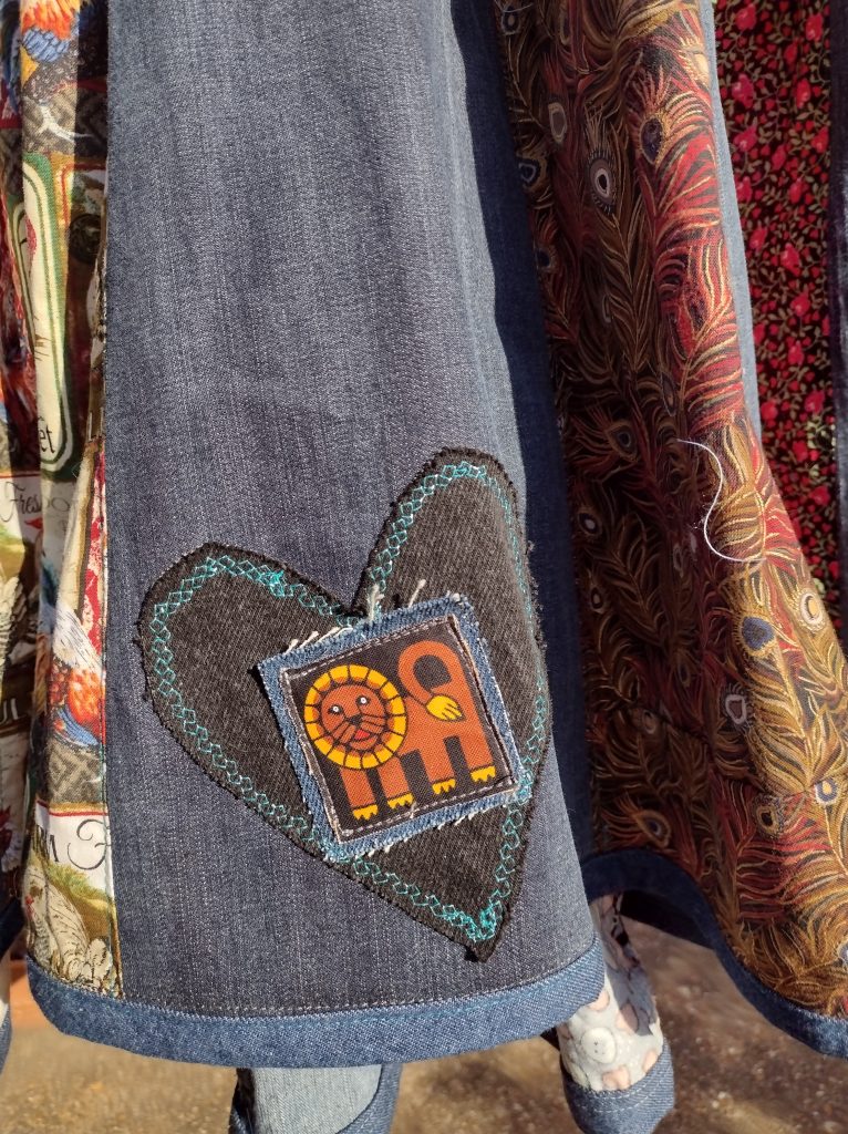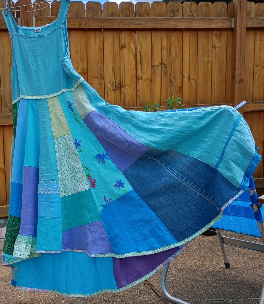 The following items for sale are one of a kind & lovingly crafted from approximately 99% repurposed denim, cotton, linen and wool. Many items were sewn using solar power.