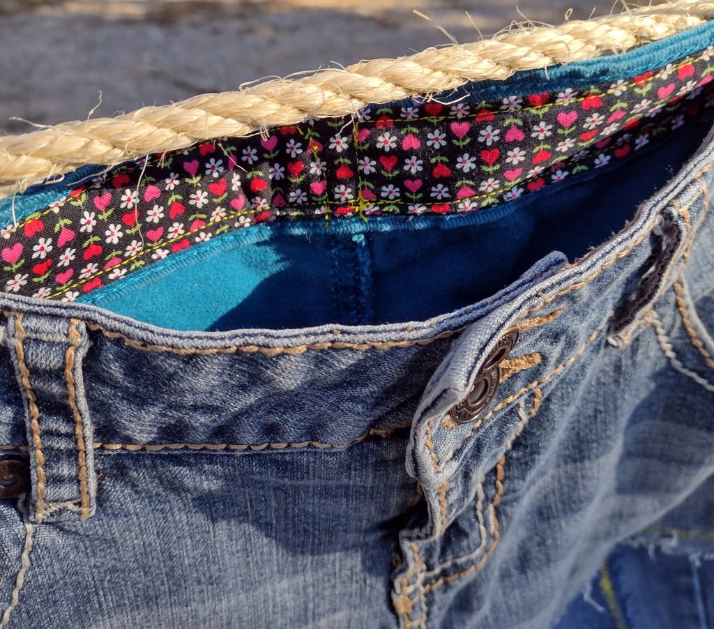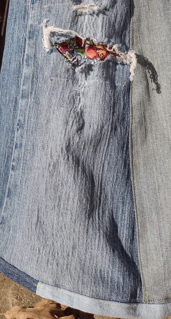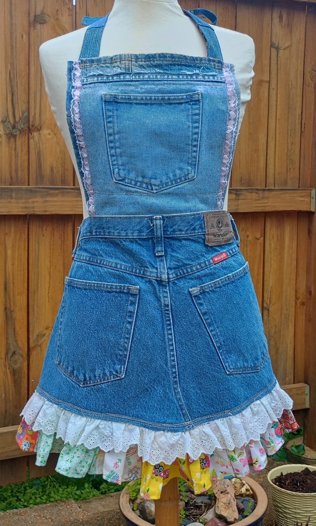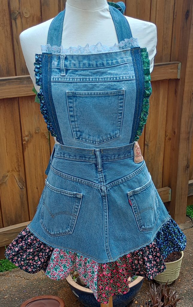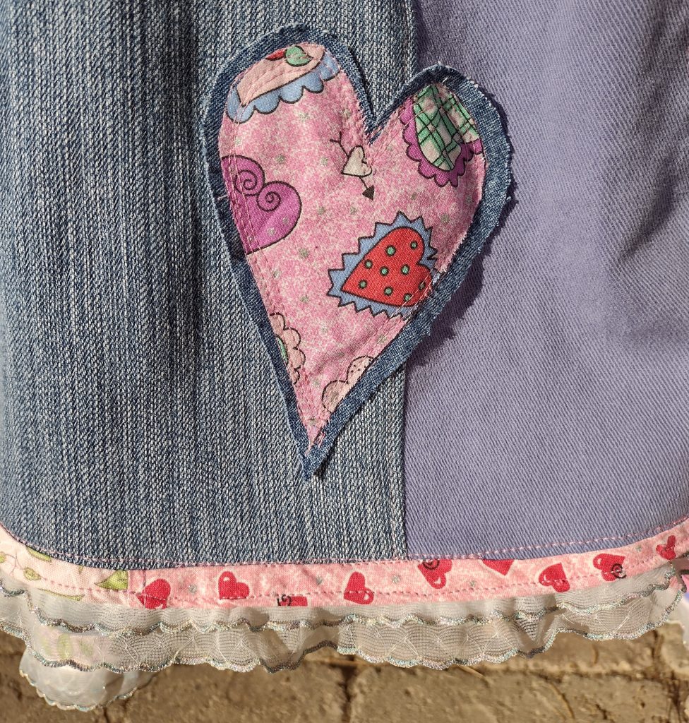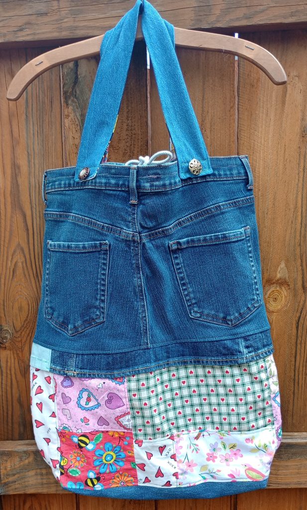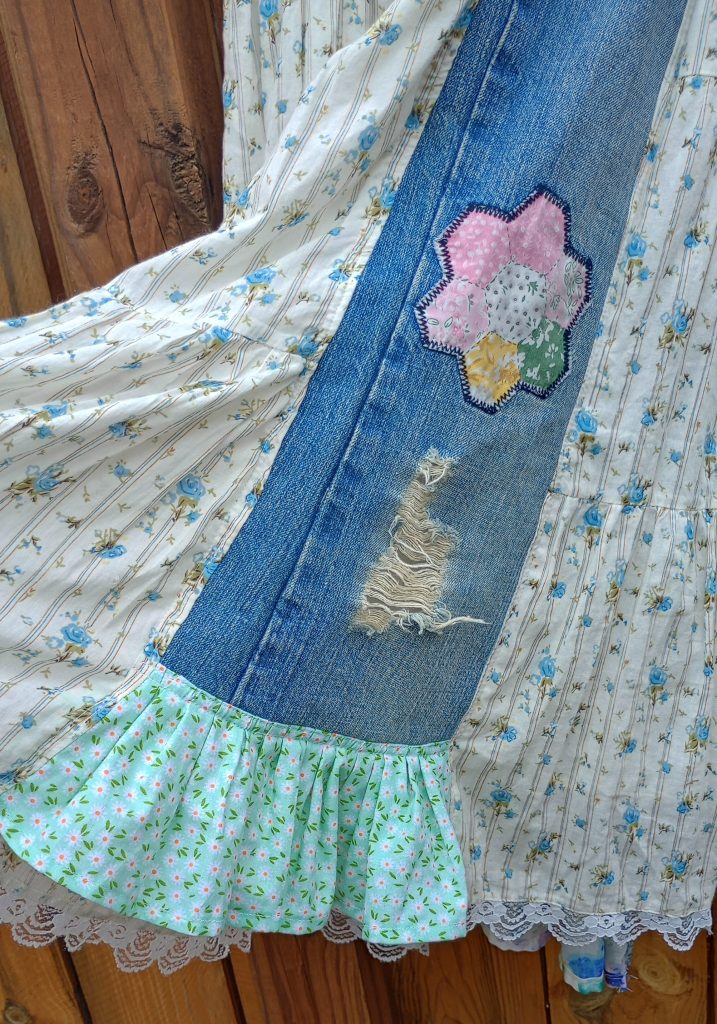 Repurposed denim and cotton. Ladies approximate size 7/8. Please contact me for exact measurements.