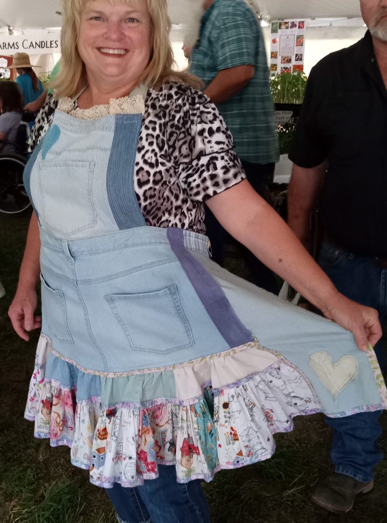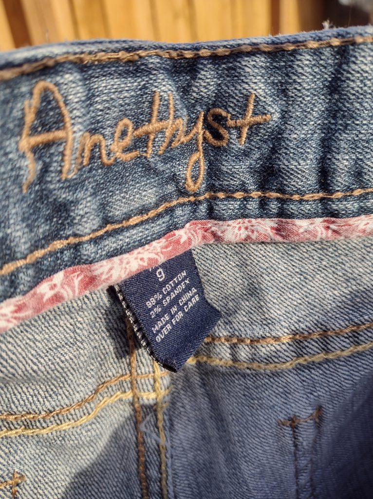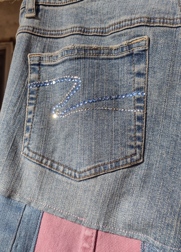 Repurposed denim & cotton. Fits approximately ladies size 3-5, depending on individual. Please contact me for measurements to be exact.