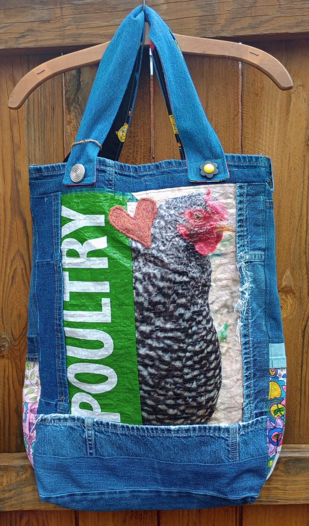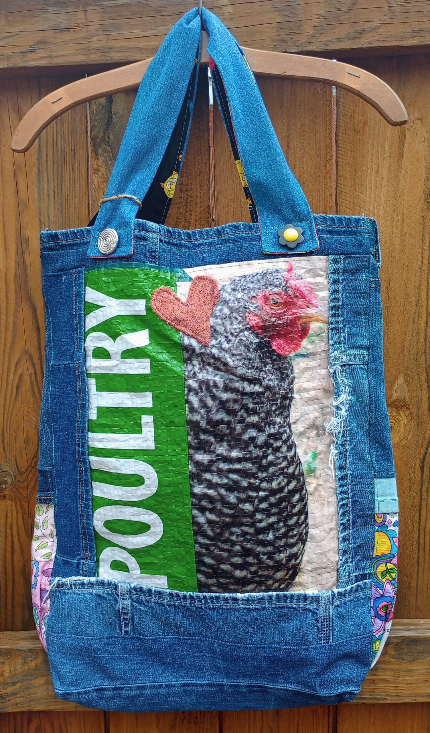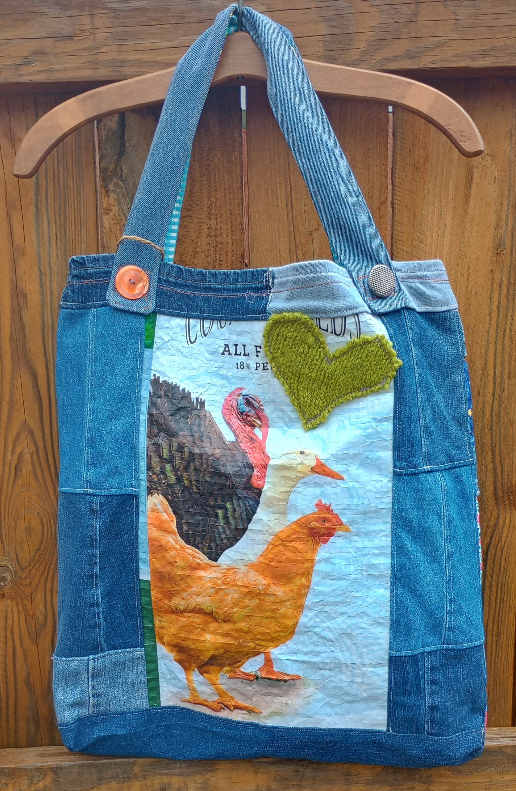 Super sized, super sturdy & super cute! Repurposed denim, cotton, buttons, wool & chicken feed bags. Fully lined.