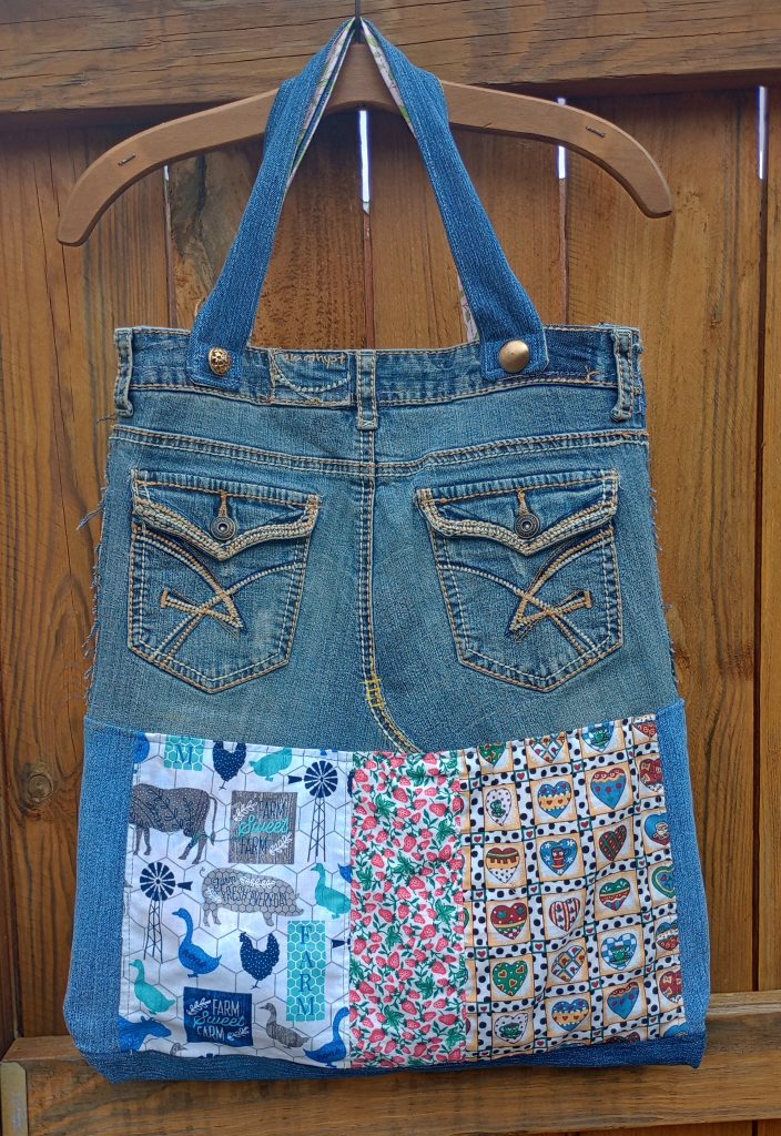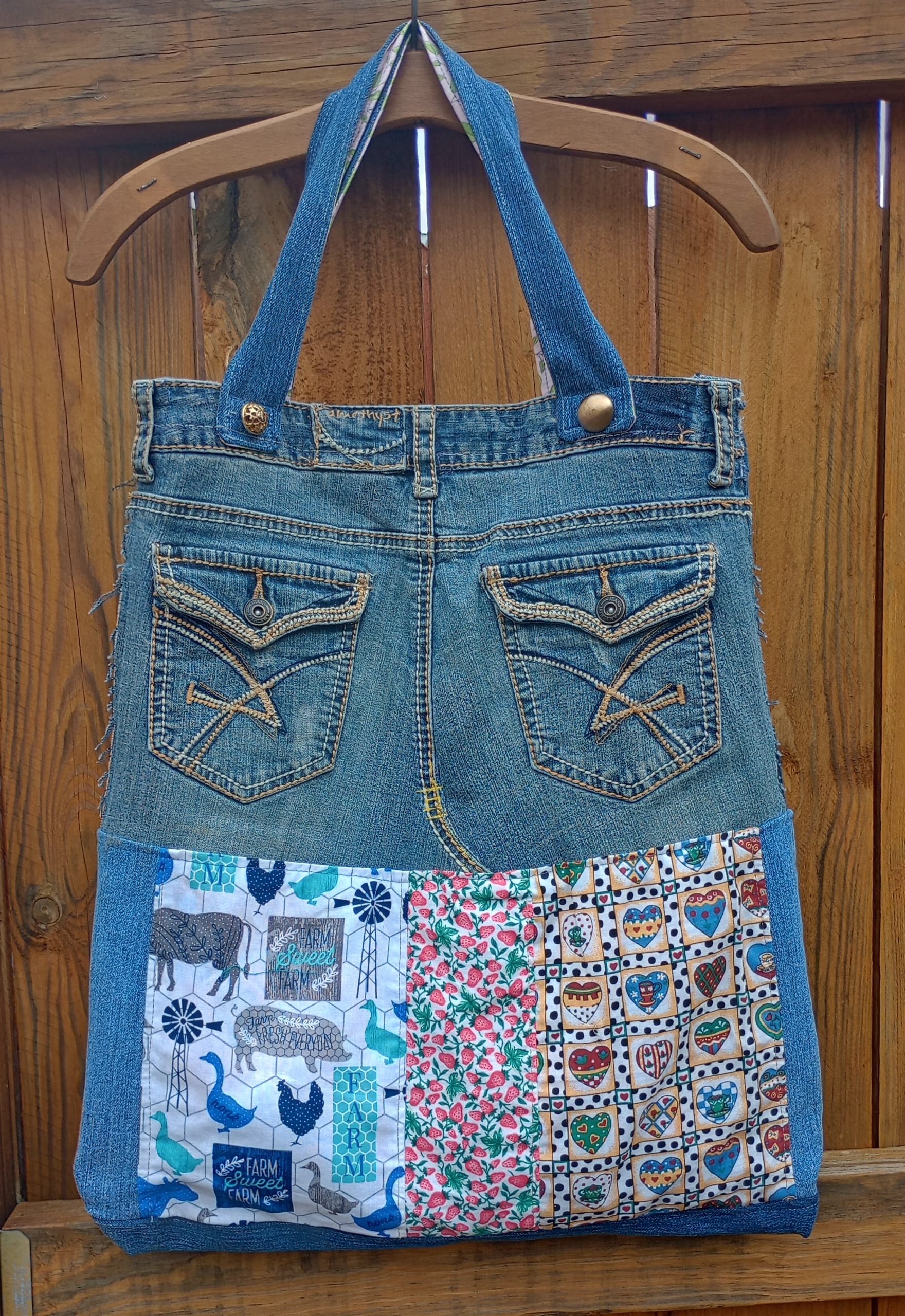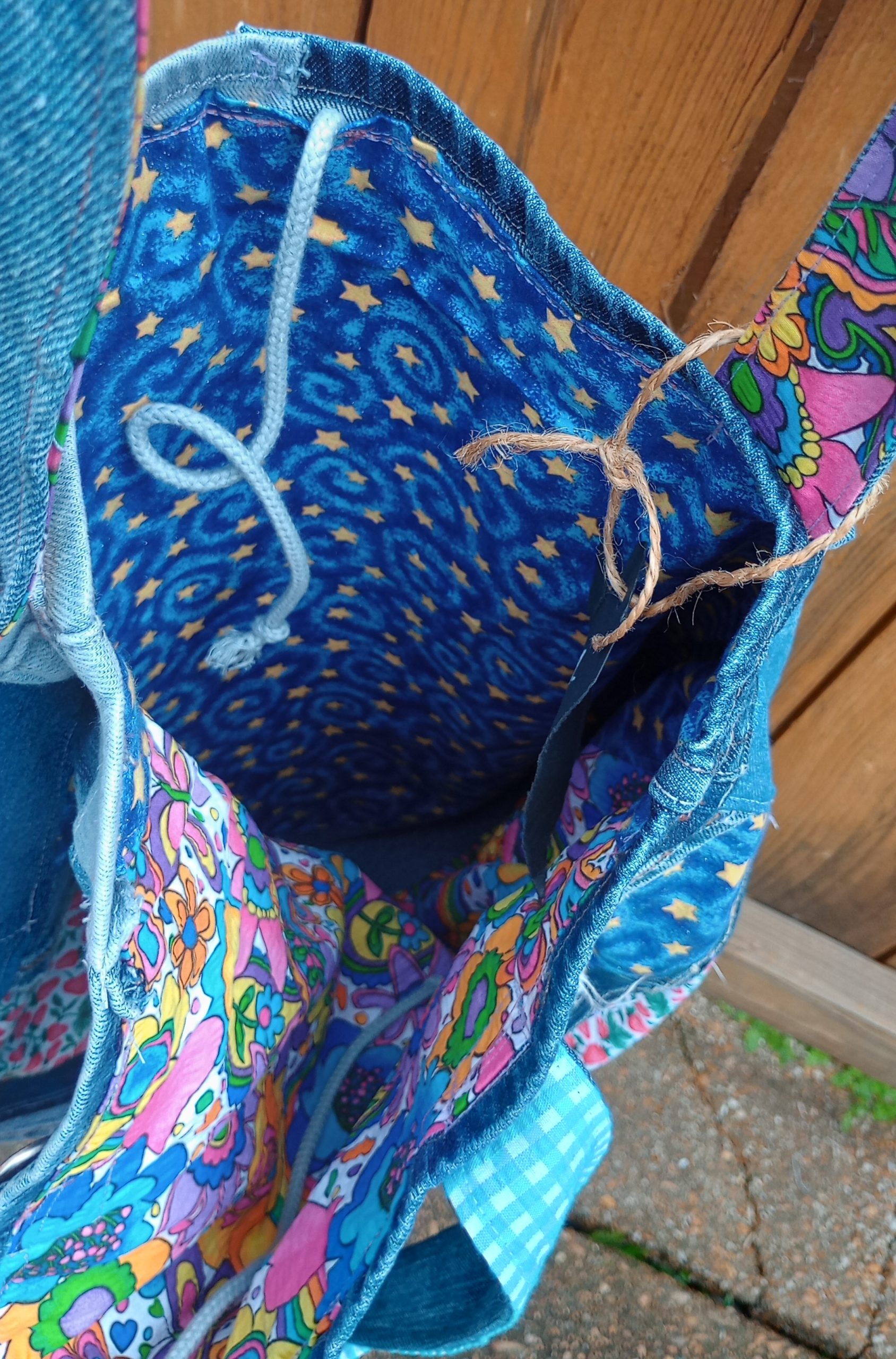 Roomy and Sturdy! Repurposed denim, cotton, buttons, wool & chicken feed bags. Fully lined. Tie closure.