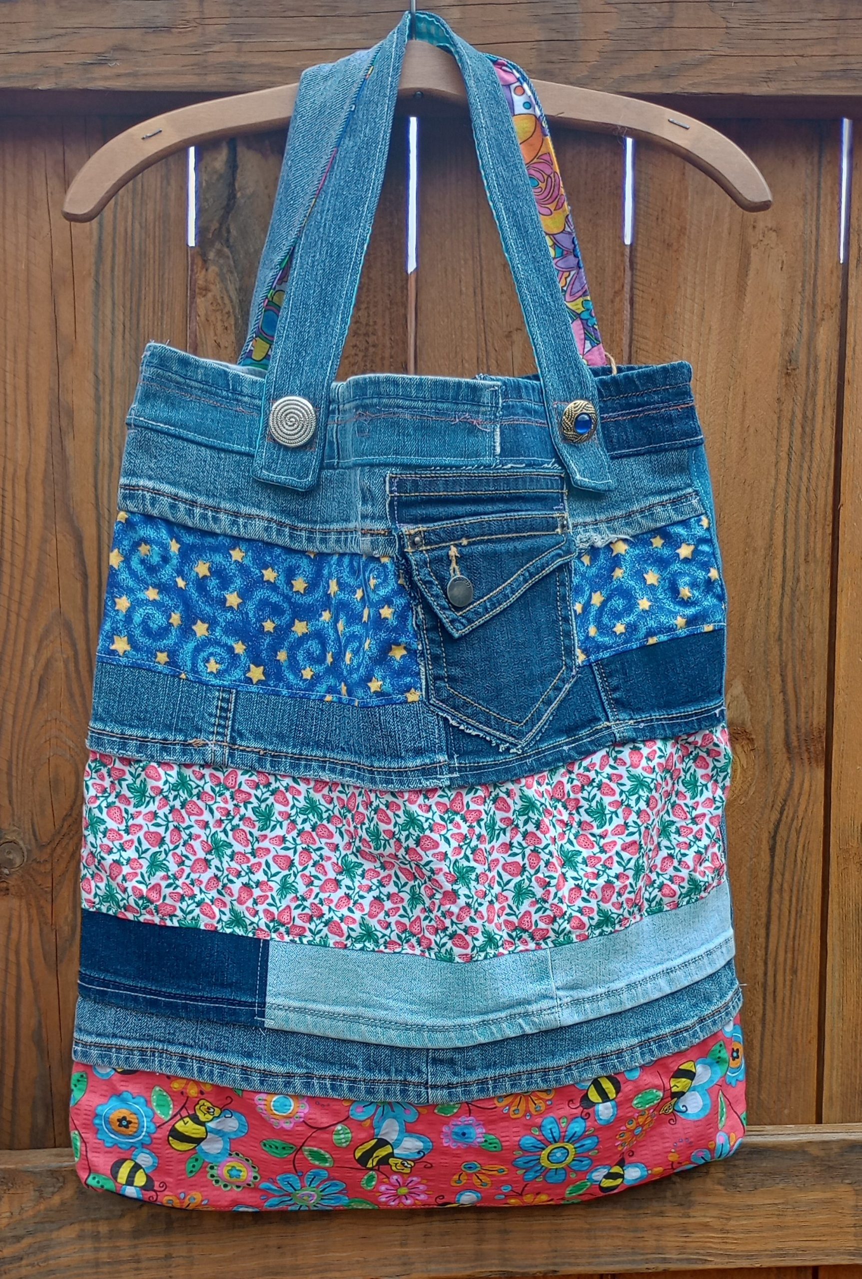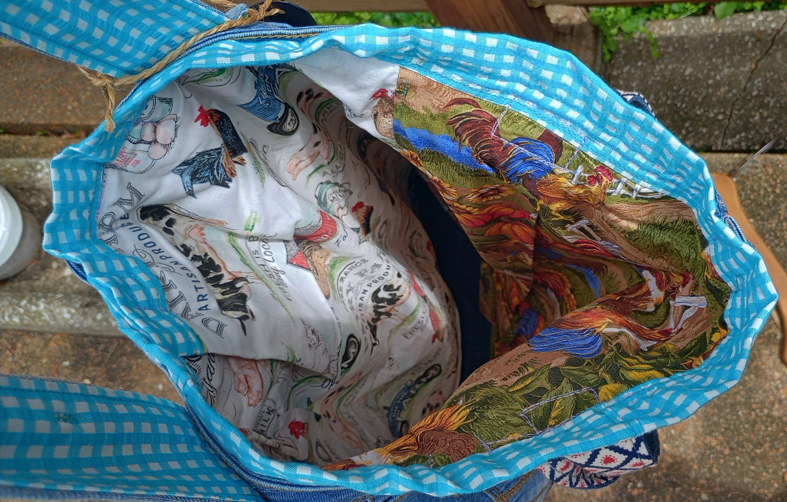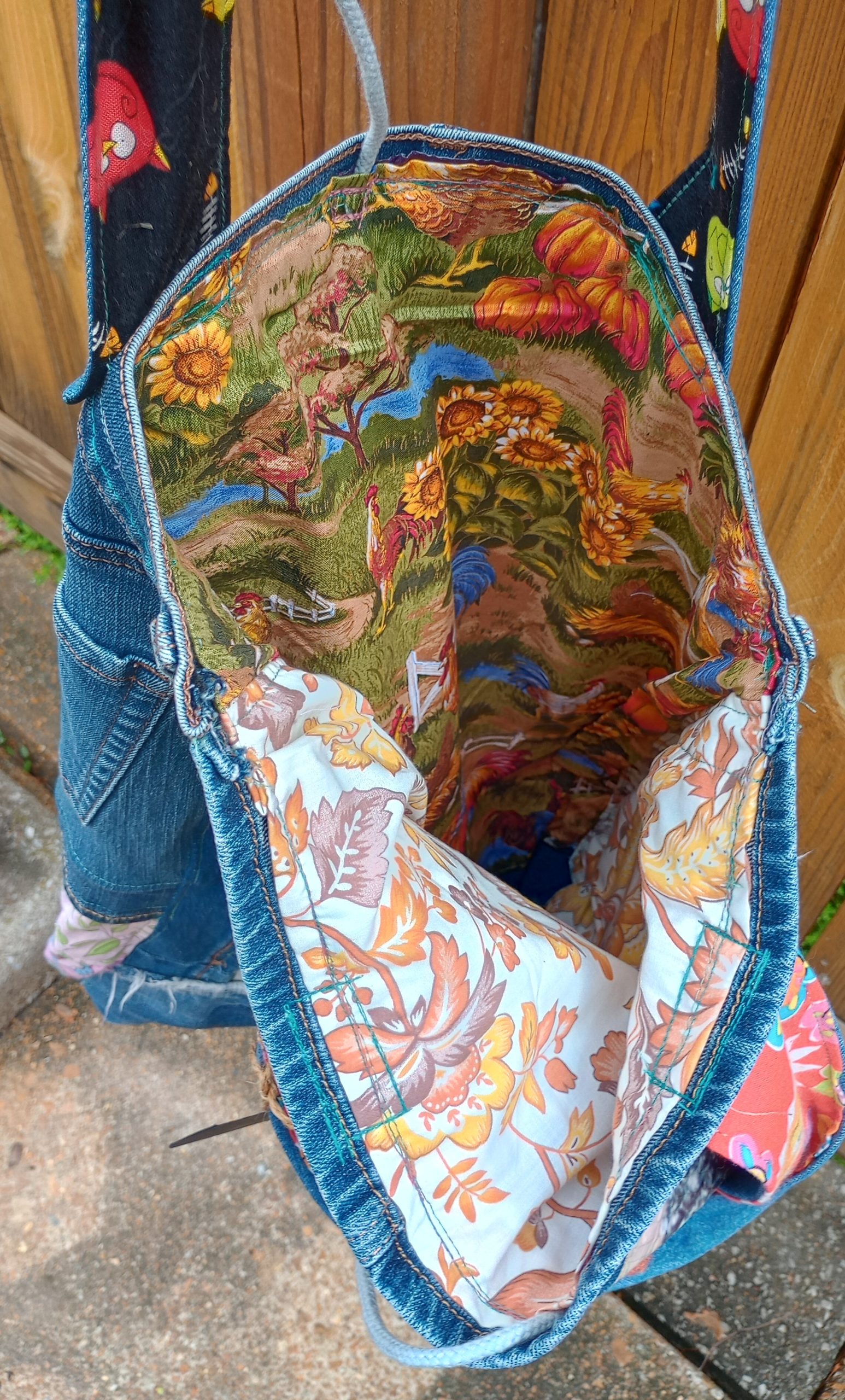 Roomy and Sturdy! Repurposed denim, cotton, buttons, wool & chicken feed bags. Fully lined. Tie closure.