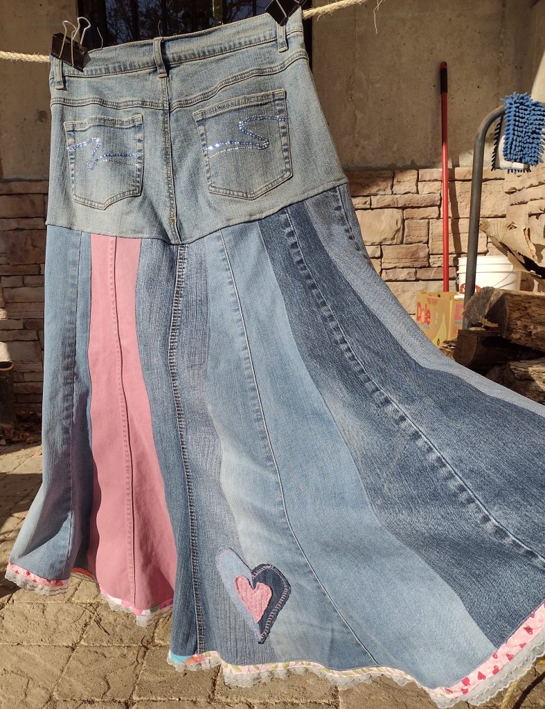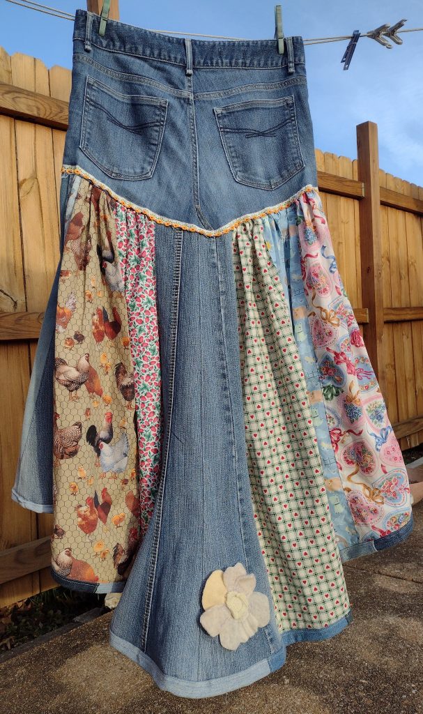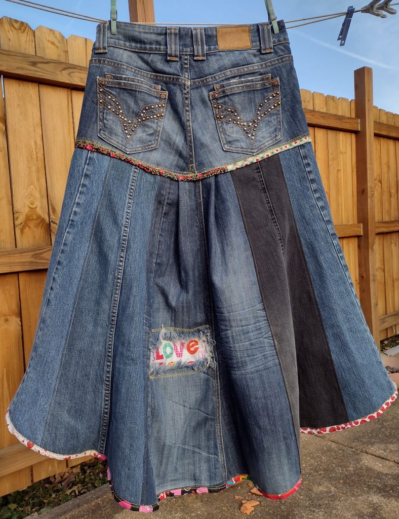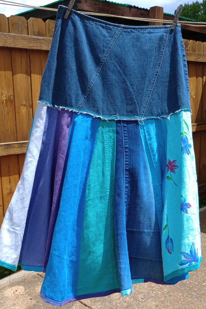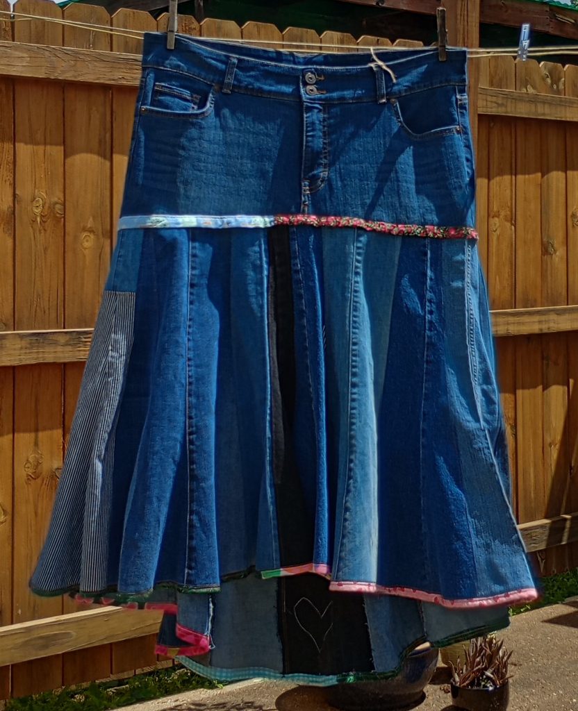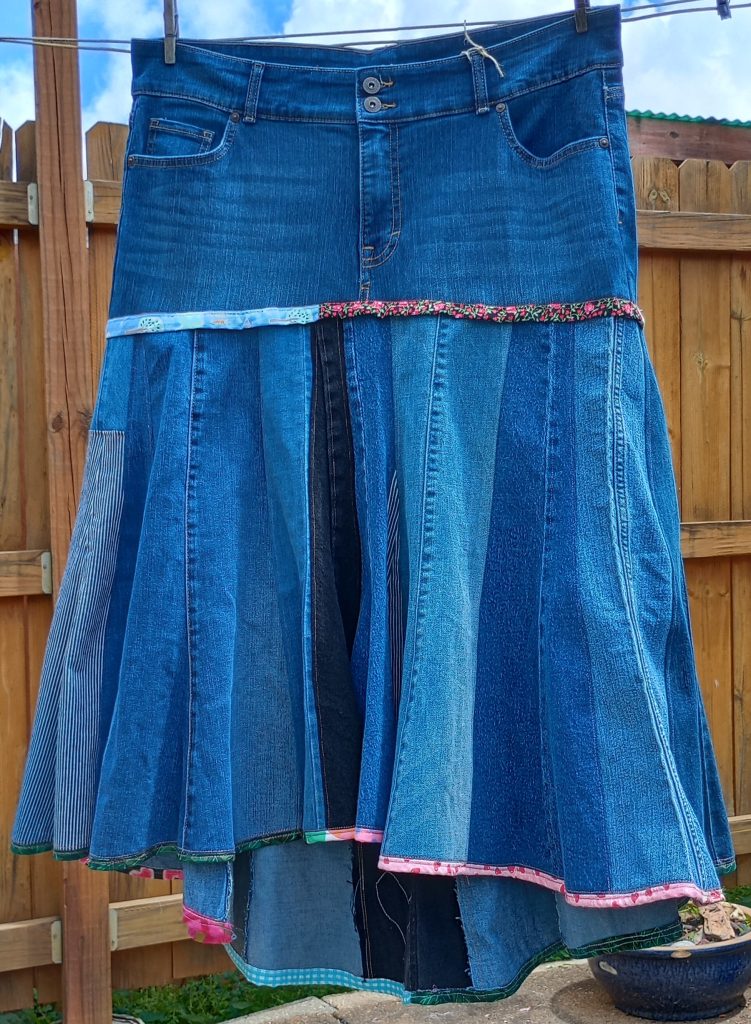 Flattering trumpet flared skirt from repurposed denim and cotton. Ladies approximate size 18/20. Please contact me for exact measurements.