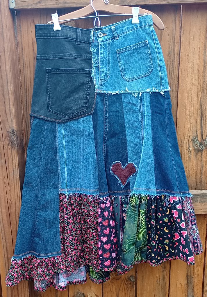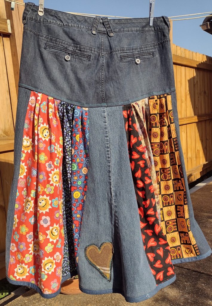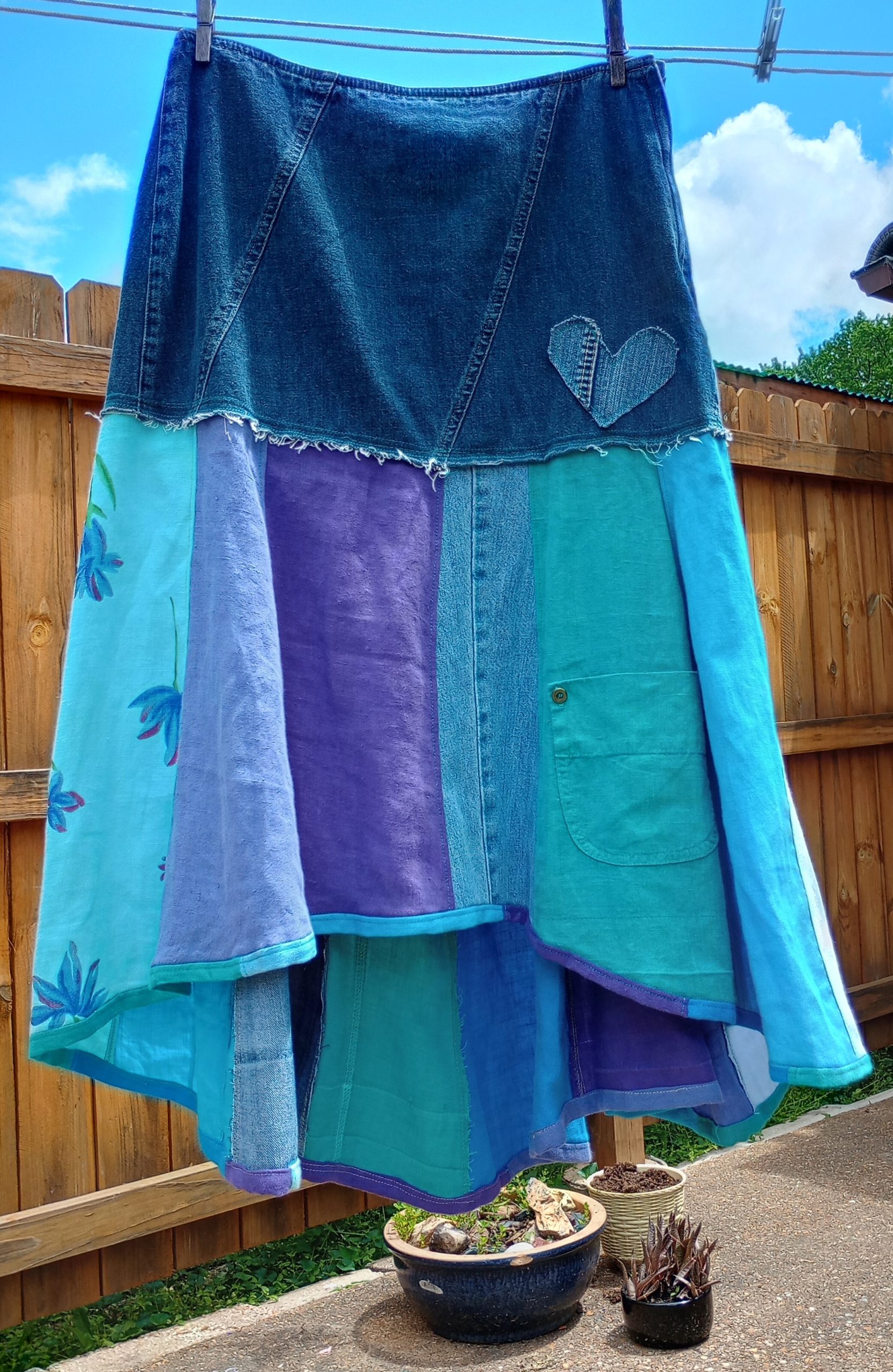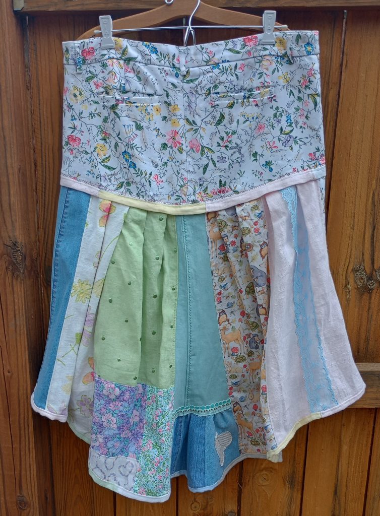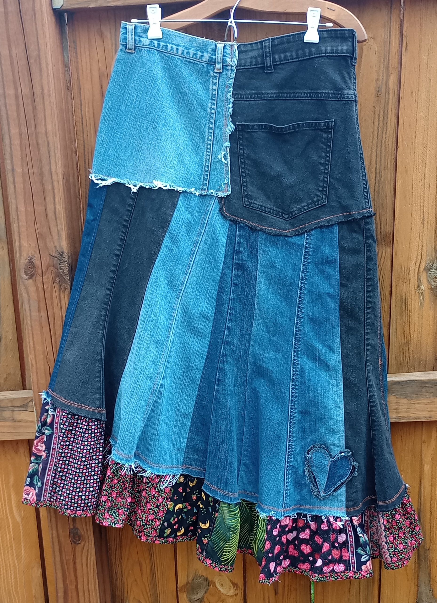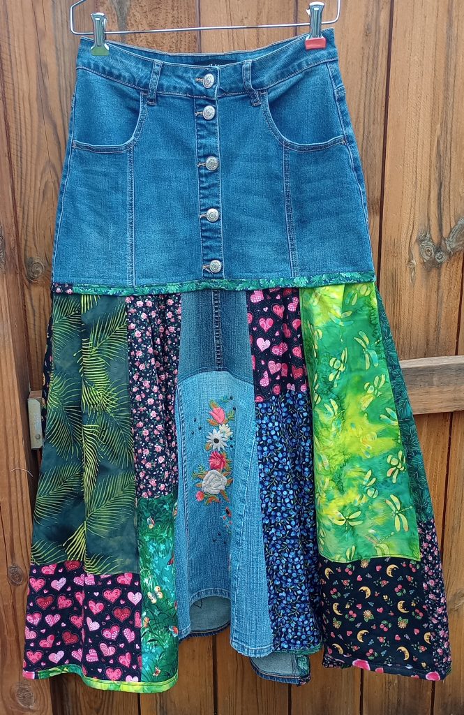 Flattering A-line skirt constructed from repurposed denim and cotton. Ladies approximate size 7/8. Please contact me for exact measurements.