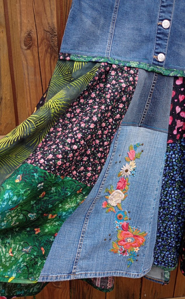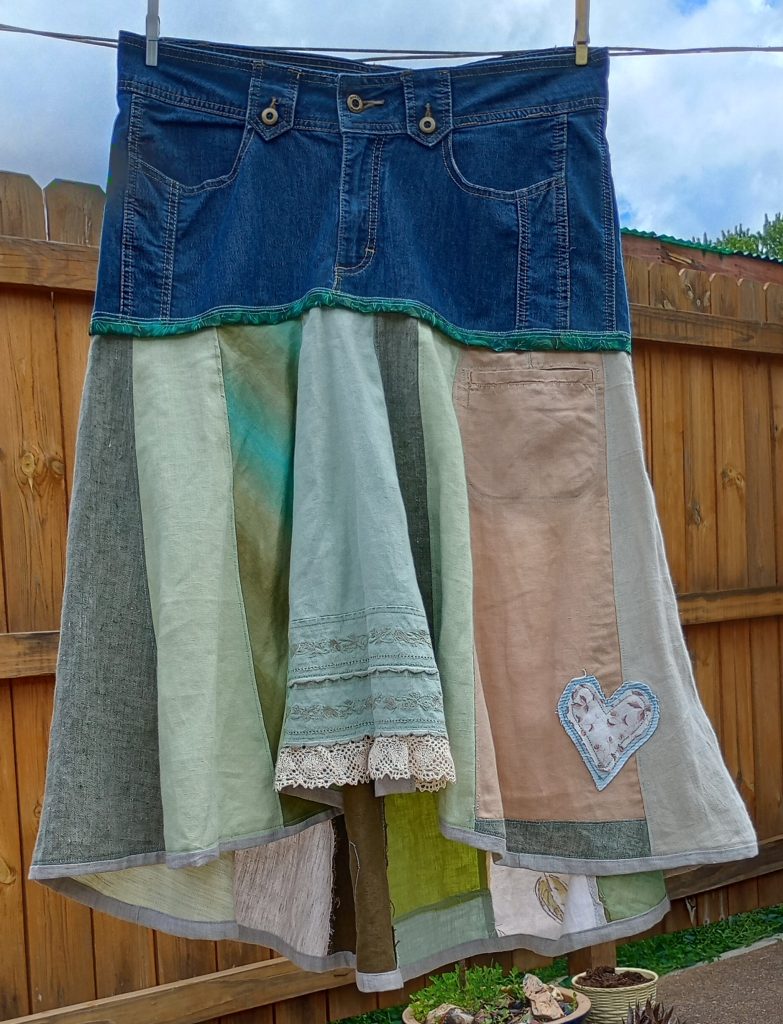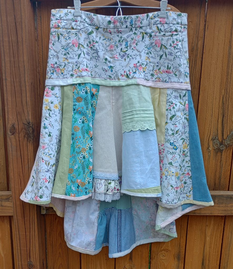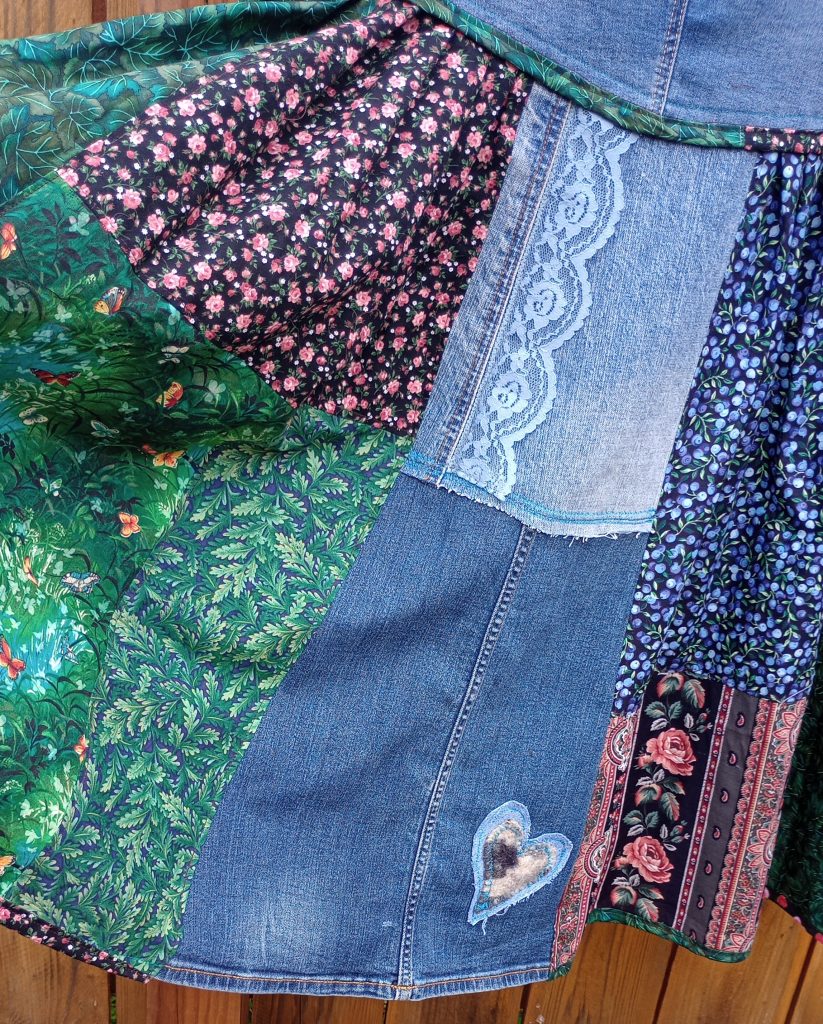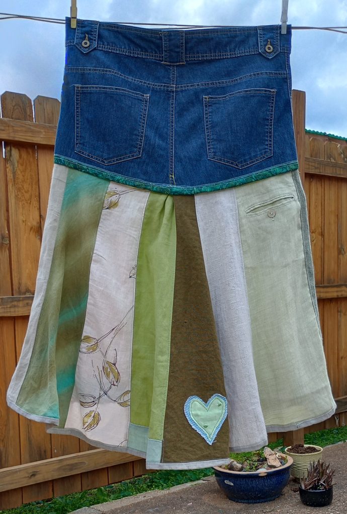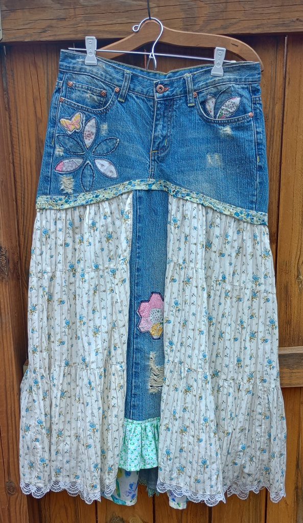 Flattering A-line skirt constructed from repurposed denim and cotton. Ladies approximate size 7/8. Please contact me for exact measurements.
