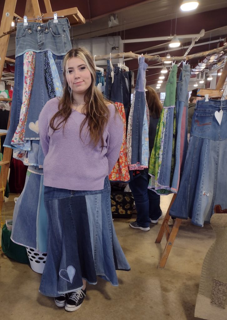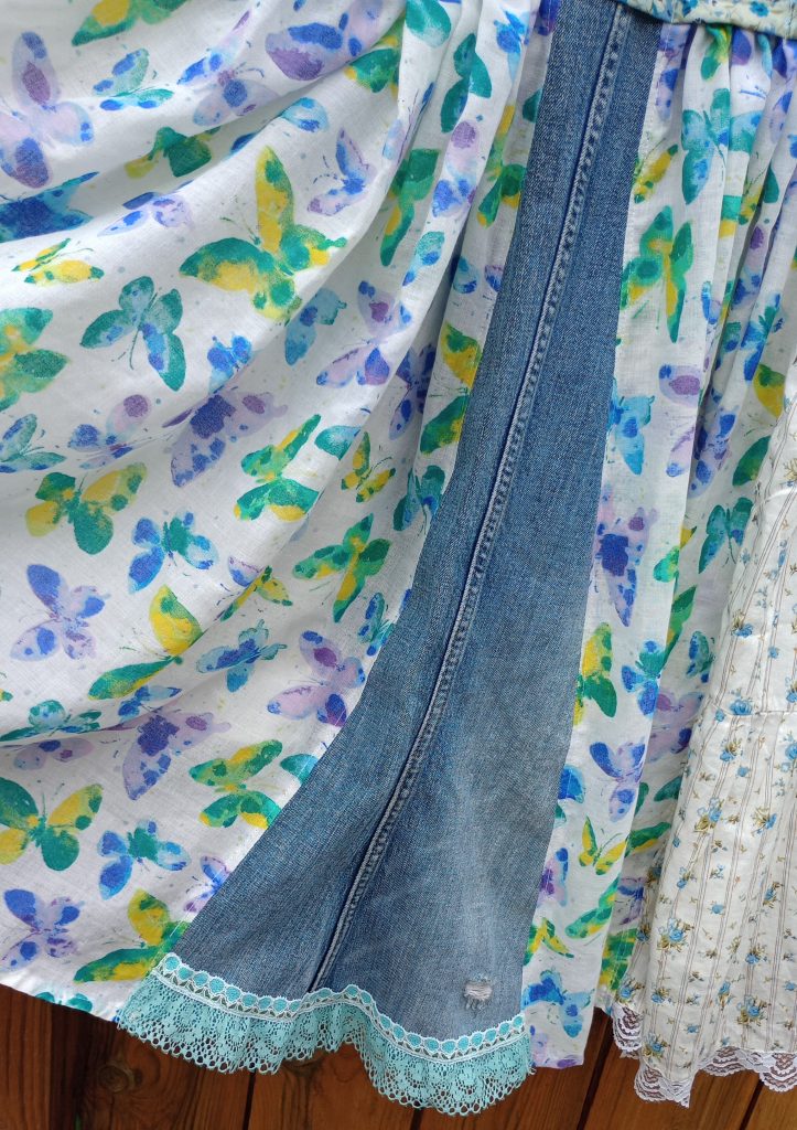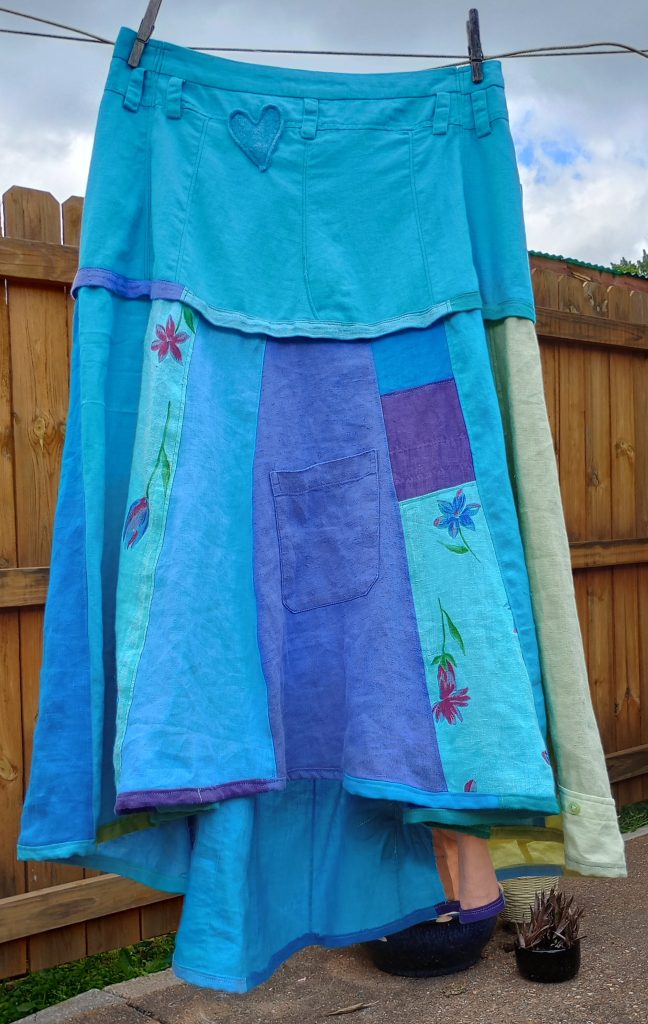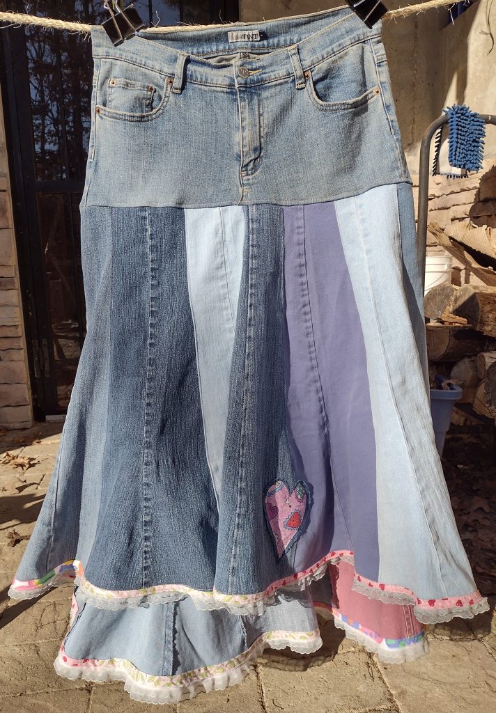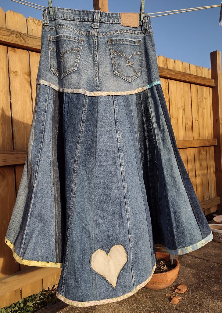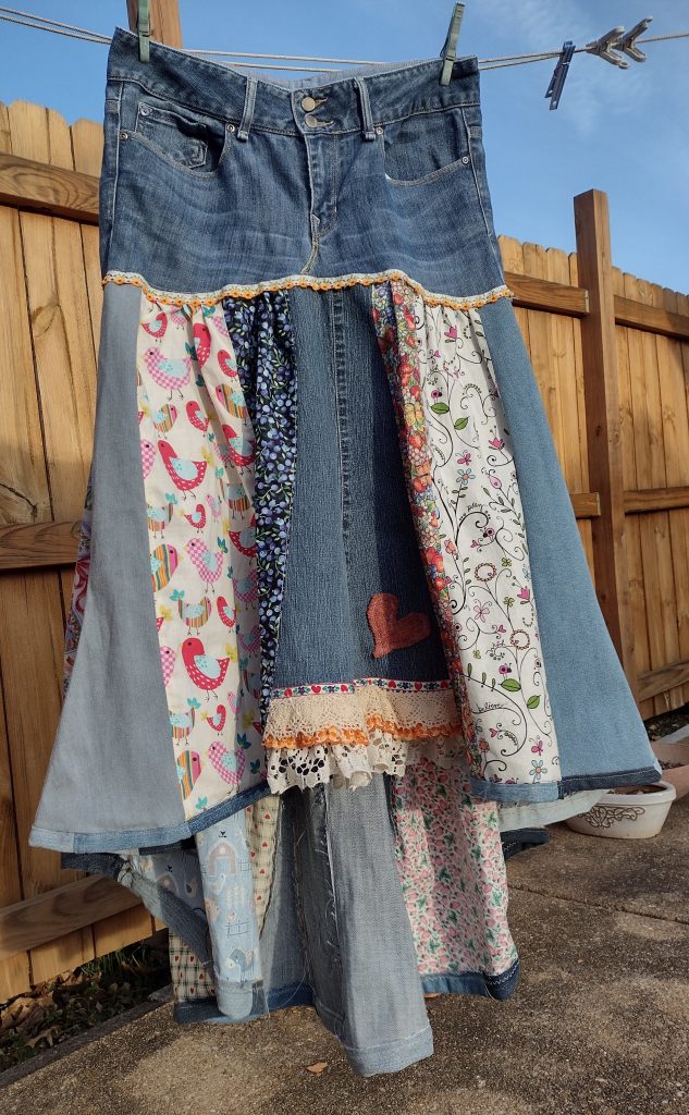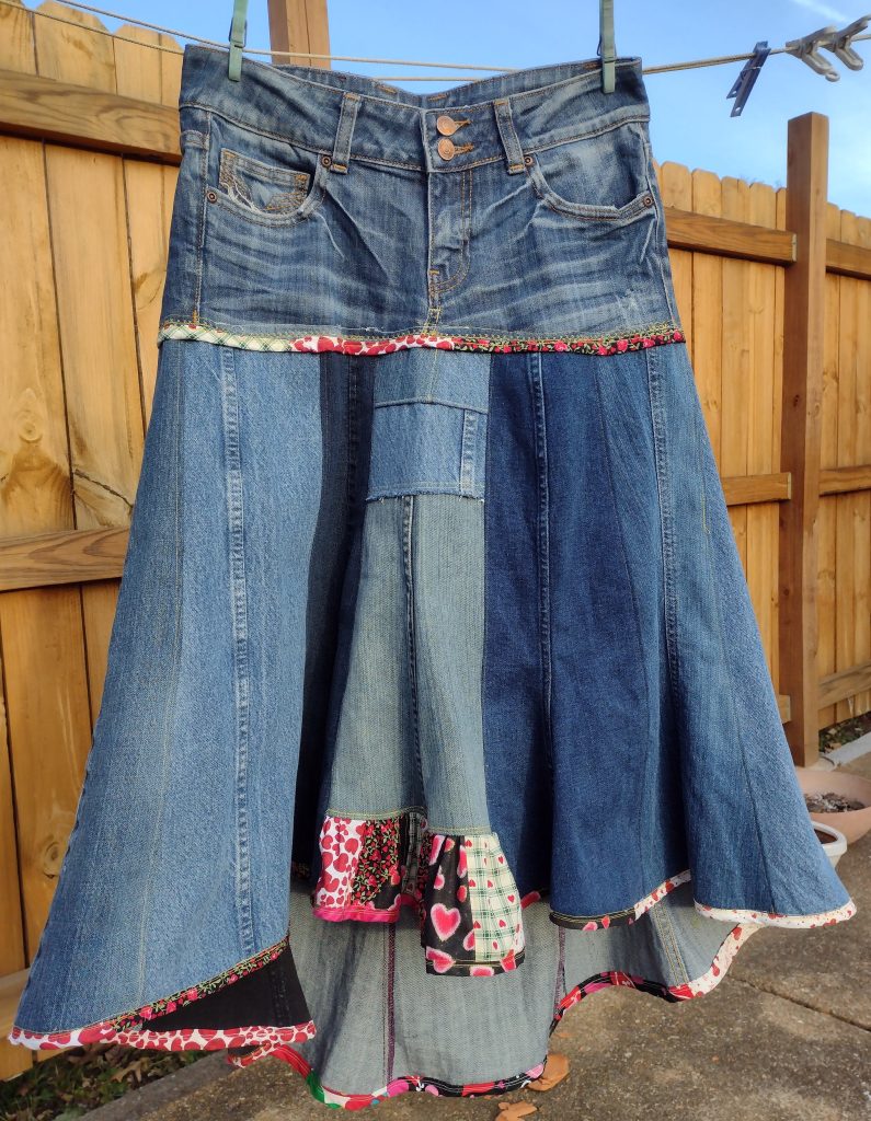 Flattering A-line skirt constructed from repurposed denim and cotton. Ladies approximate size 7/8. Please contact me for exact measurements.
