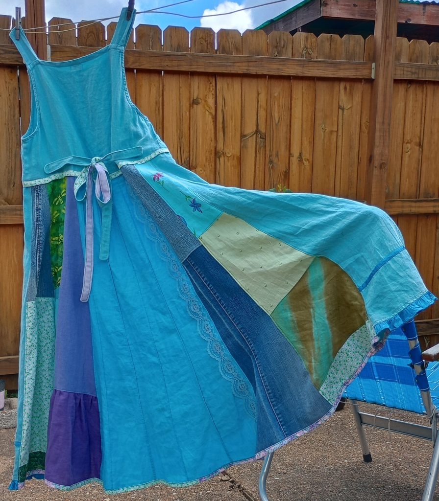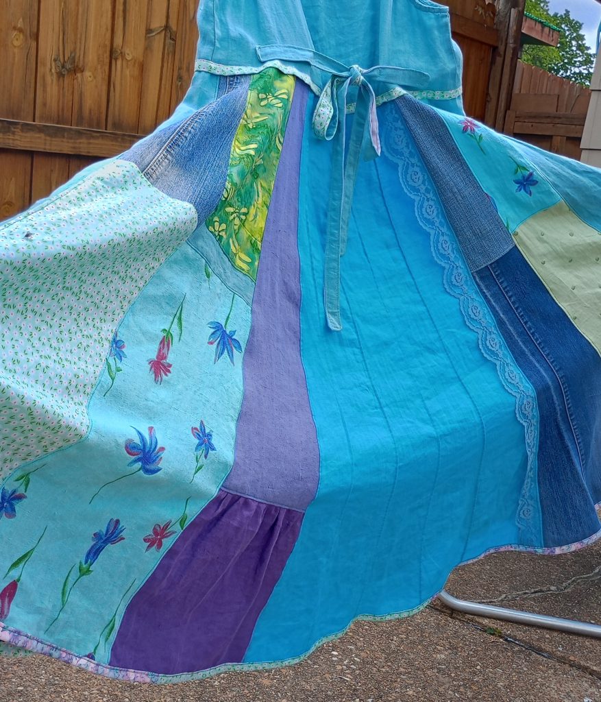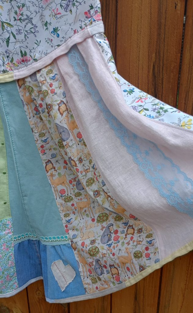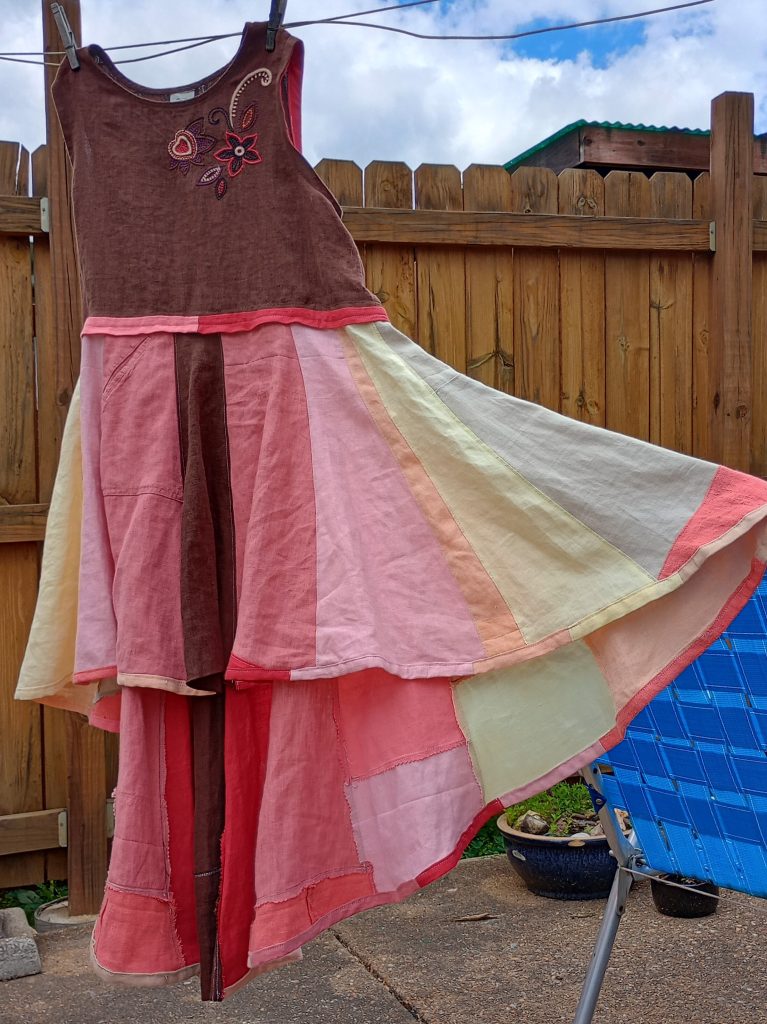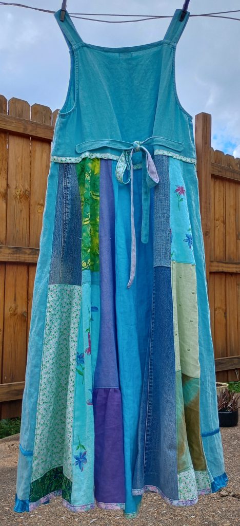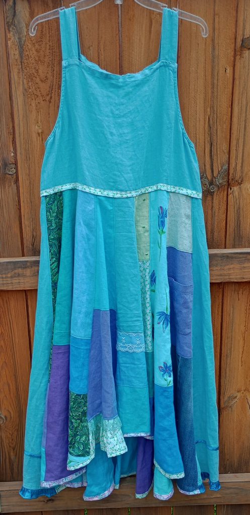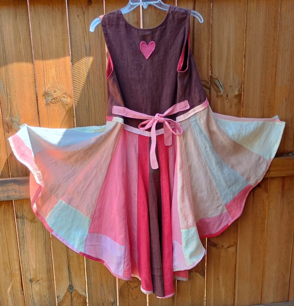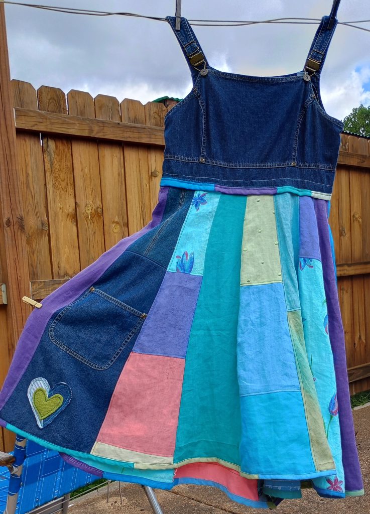 Cute and colorful repurposed denim and linen dress with adjustable suspender straps. Ladies approximate size 5/6. Please contact me for exact measurements.