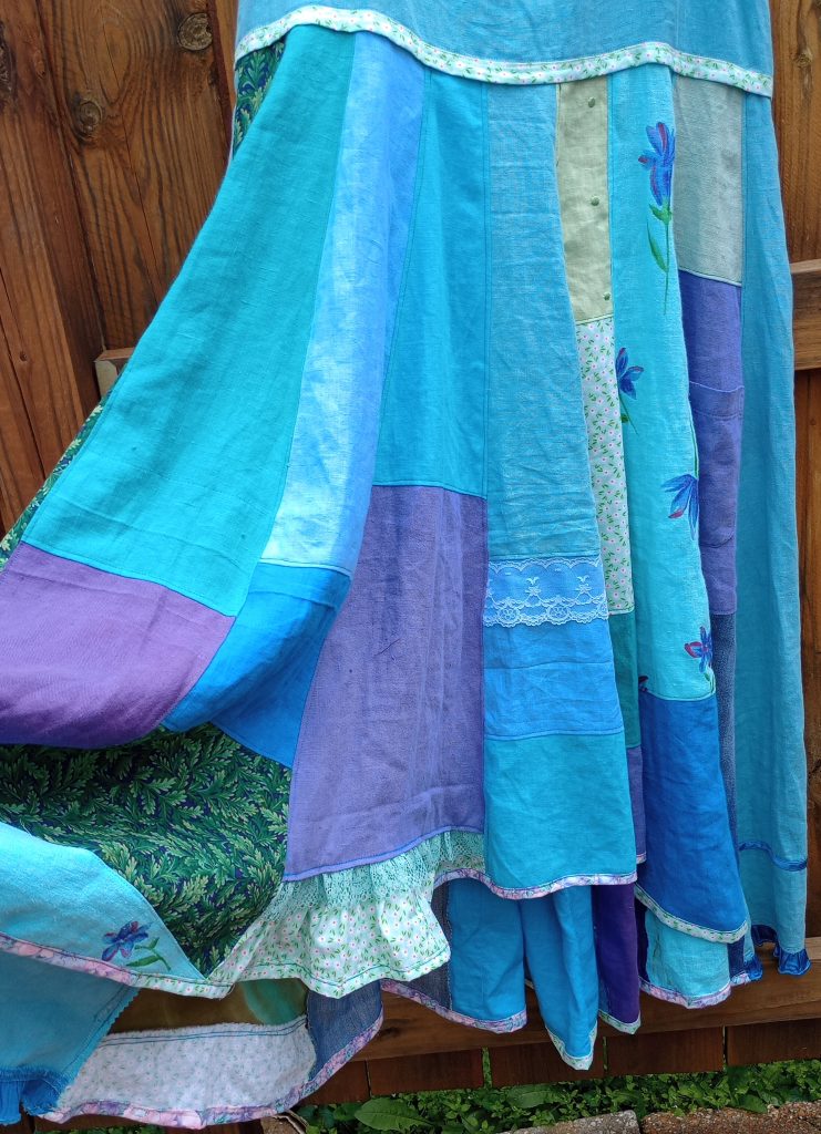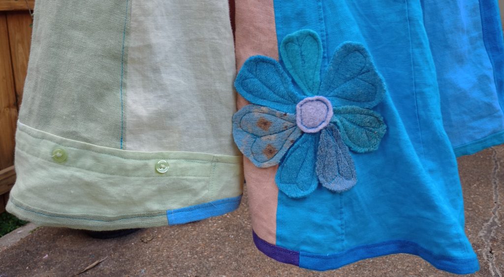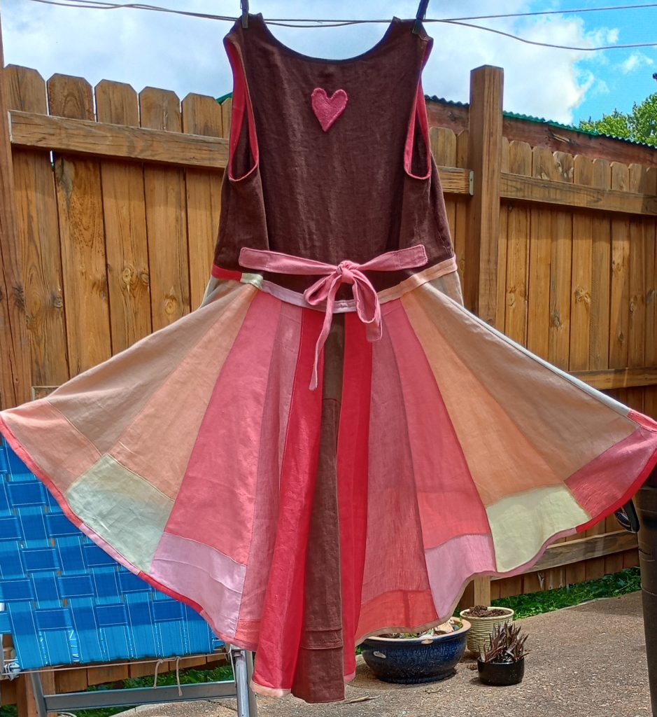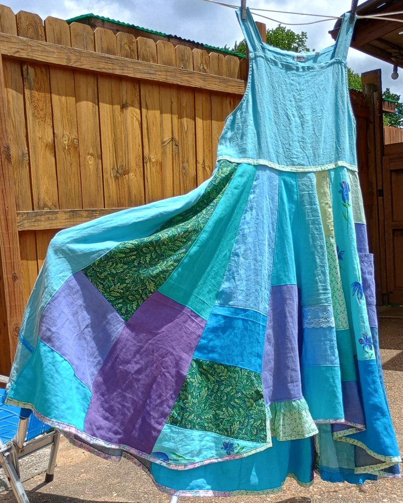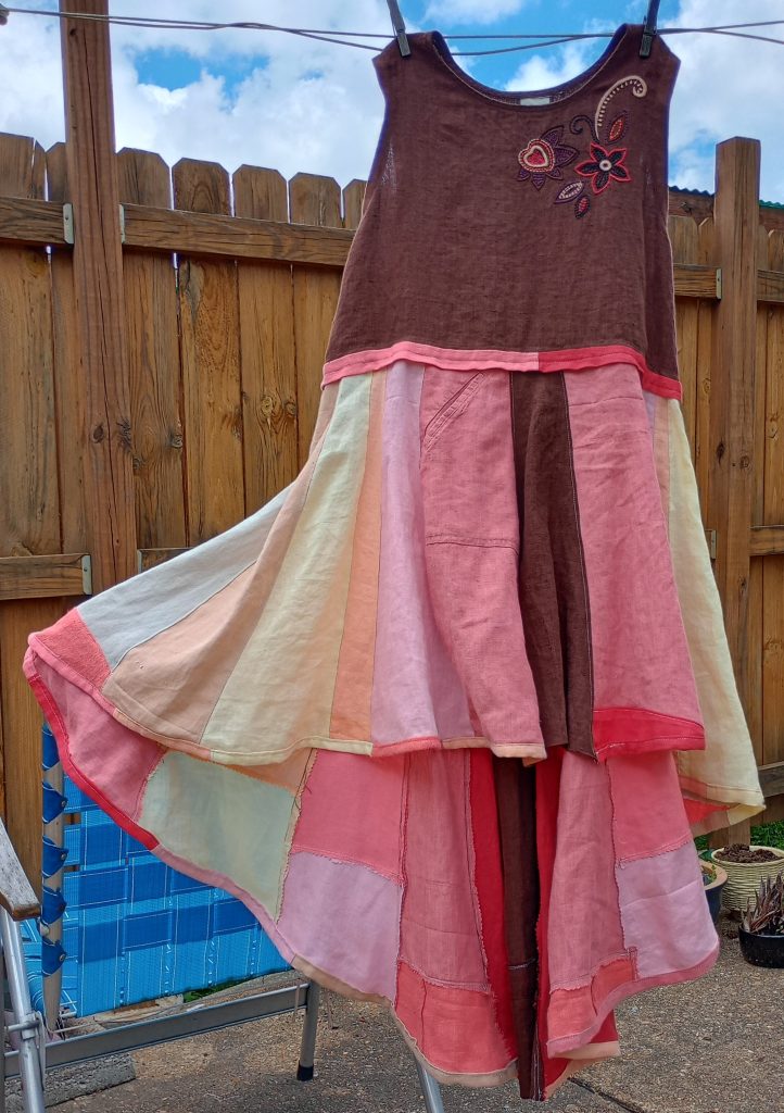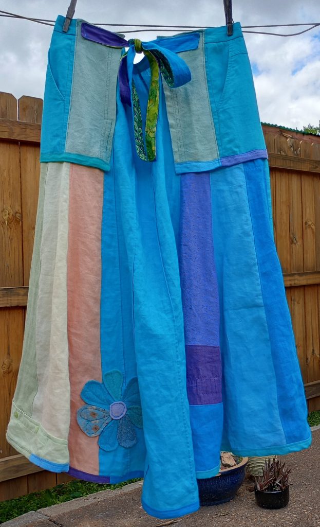 Artfully constructed from repurposed linen and wool. Dramatically cascading skirt in bright cheerful colors. Ladies size S/M. Please contact me for exact measurements.