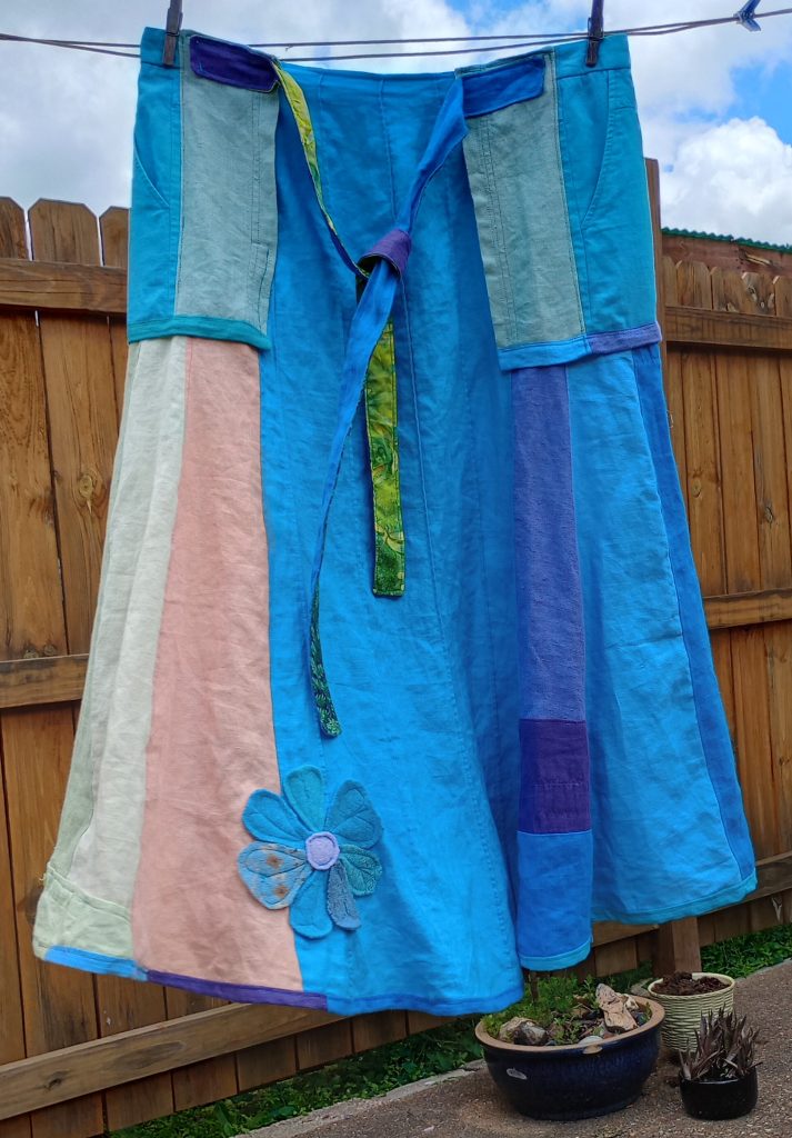 Artfully assembled & slightly adjustable wrap style repurposed linen, cotton and wool skirt with snap and tie back. Ladies size M/L/XL. Please contact me regarding exact sizes.