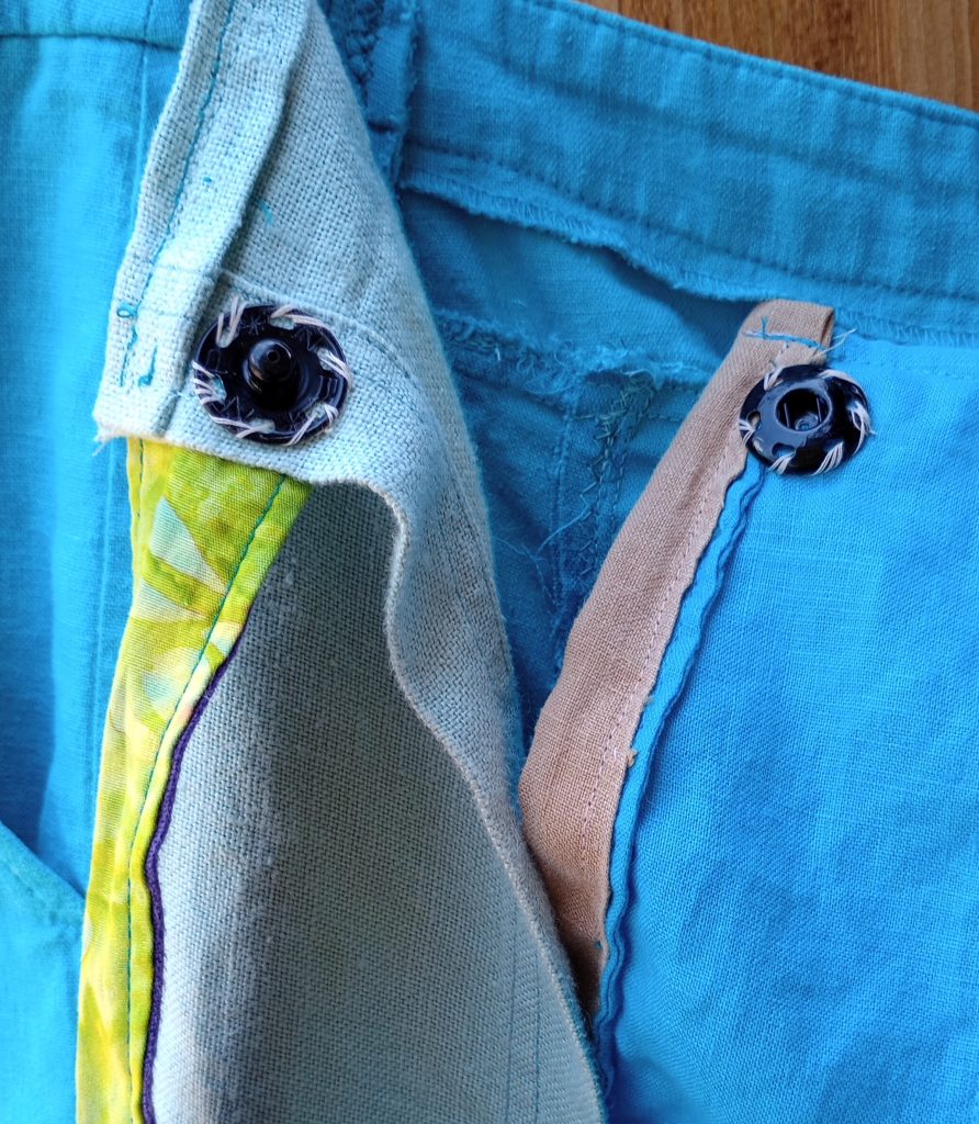 Repurposed cotton, denim, wool & linen. Ladies low fitting trouser style, approximately size 8/10. Please contact me for exact measurements.