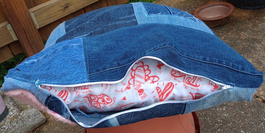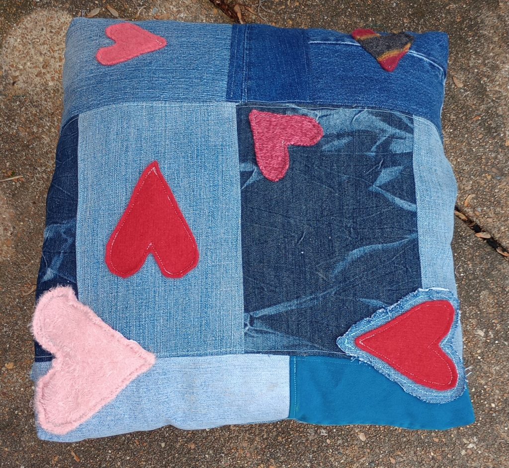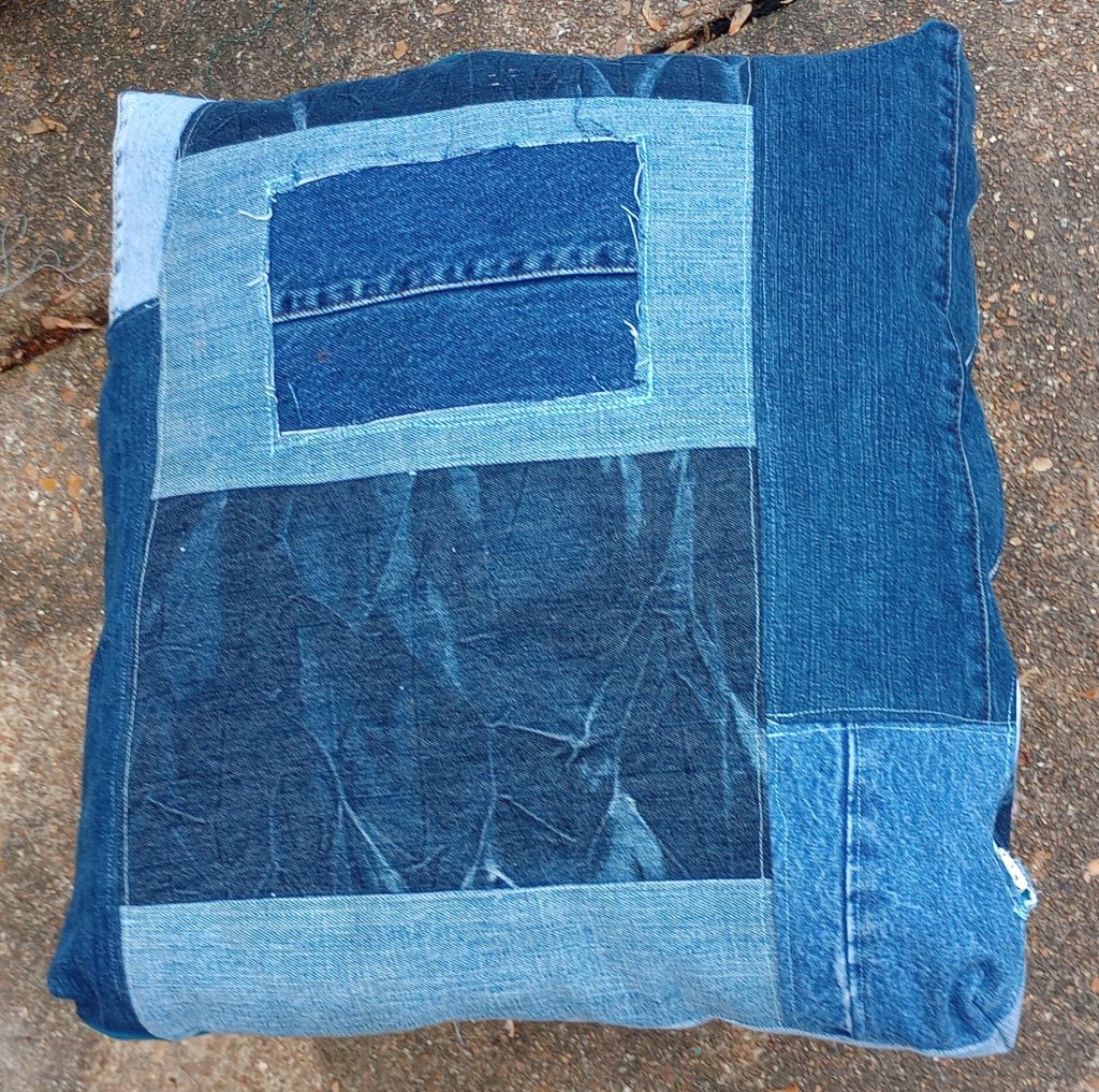 Outer cover removable via zipper, for washing. Constructed with repurposed denim, cotton and wool. Inner stuffing is made using 100% repurposed scraps from wool sweaters.