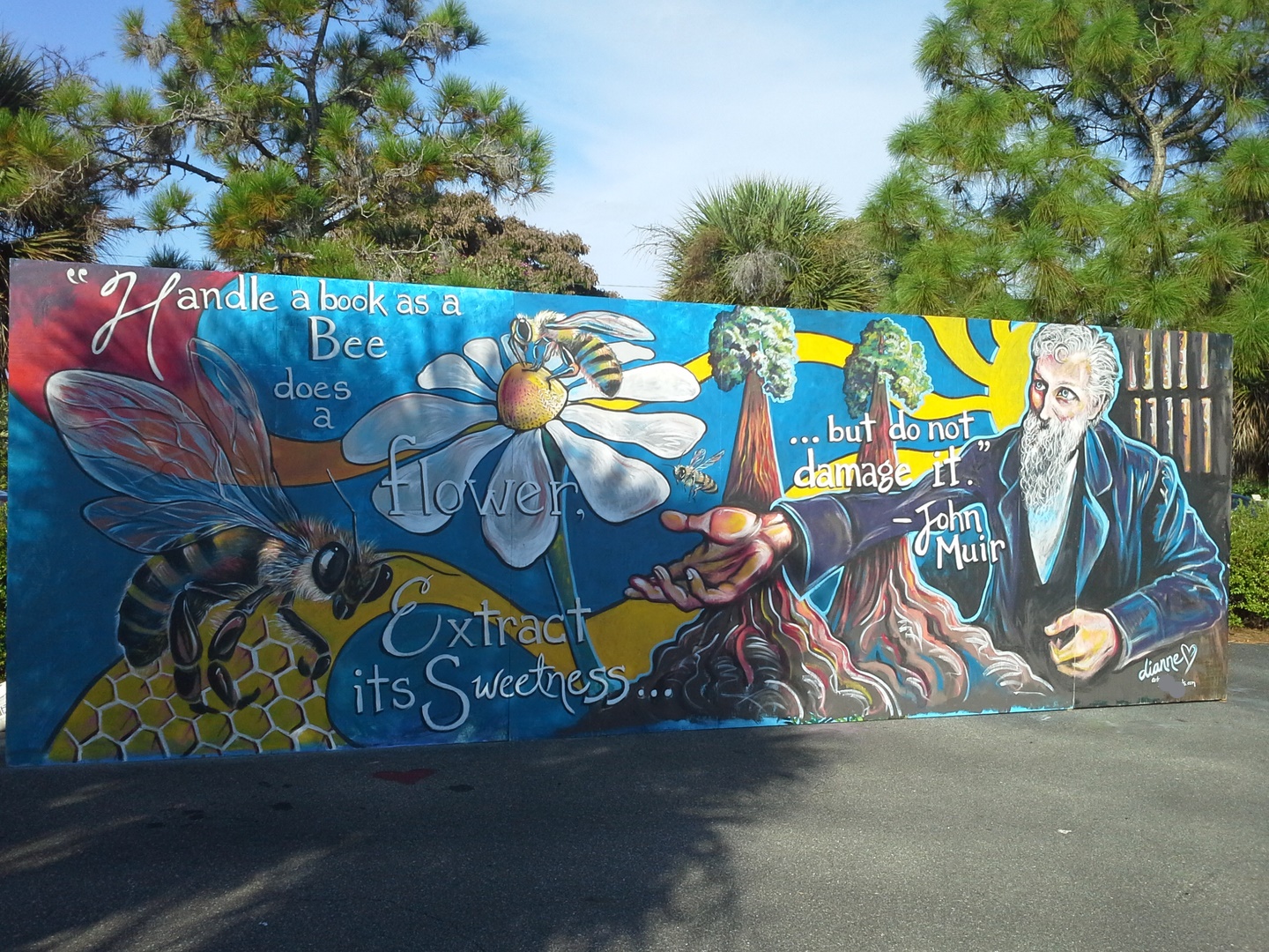 Featured mural for Sarasota Chalk Festival, Endangered Species Theme. Title: “Bees, Books, Belief.” Latex on plywood, 24′ x 8′