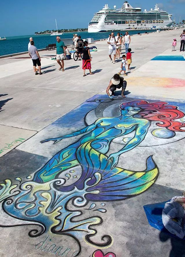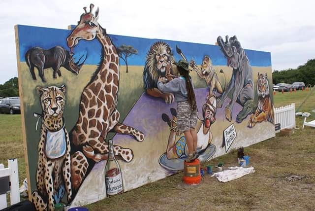 Featured latex mural at Sarasota Chalk Festival. Eat, Drink and Be Merry Theme. Latex on plywood, 24′ x 9′. Featured on Smithsonianmag.com: https://www.smithsonianmag.com/travel/these-3d-pavement-paintings-take-chalk-art-whole-new-level-180957339/957339/